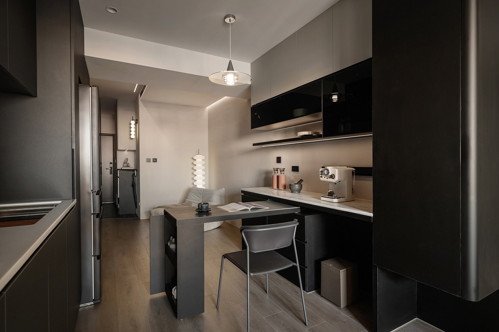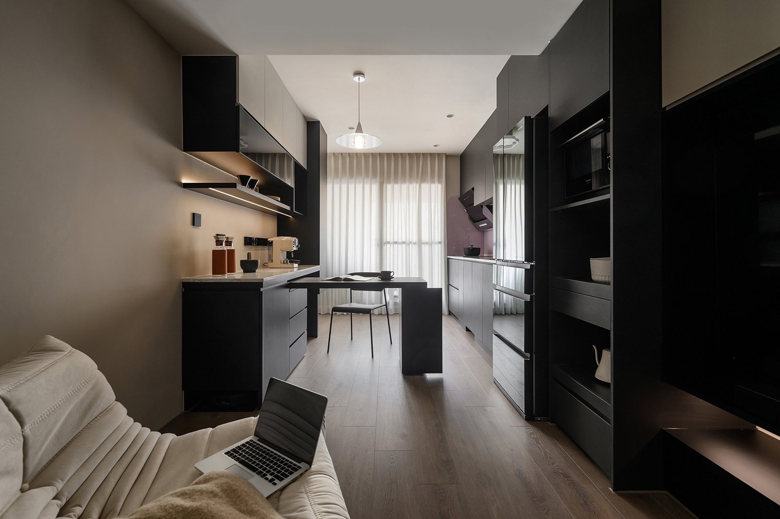 本案為小型住宅設計,旨在打造富有生活光影的溫暖居所。以屋主偏愛的暗黑色系為主軸,運用黑、米灰與木質構築沉穩溫潤的MCM語彙。選用霧面櫃體、石材檯面與金屬細節,透過材料肌理與層次照明,使深色空間兼具溫度與秩序。櫃體與牆面轉角以倒R角修飾,並以跳色與軟裝點綴視覺焦點,整體線條柔和、個性鮮明且保持平衡。