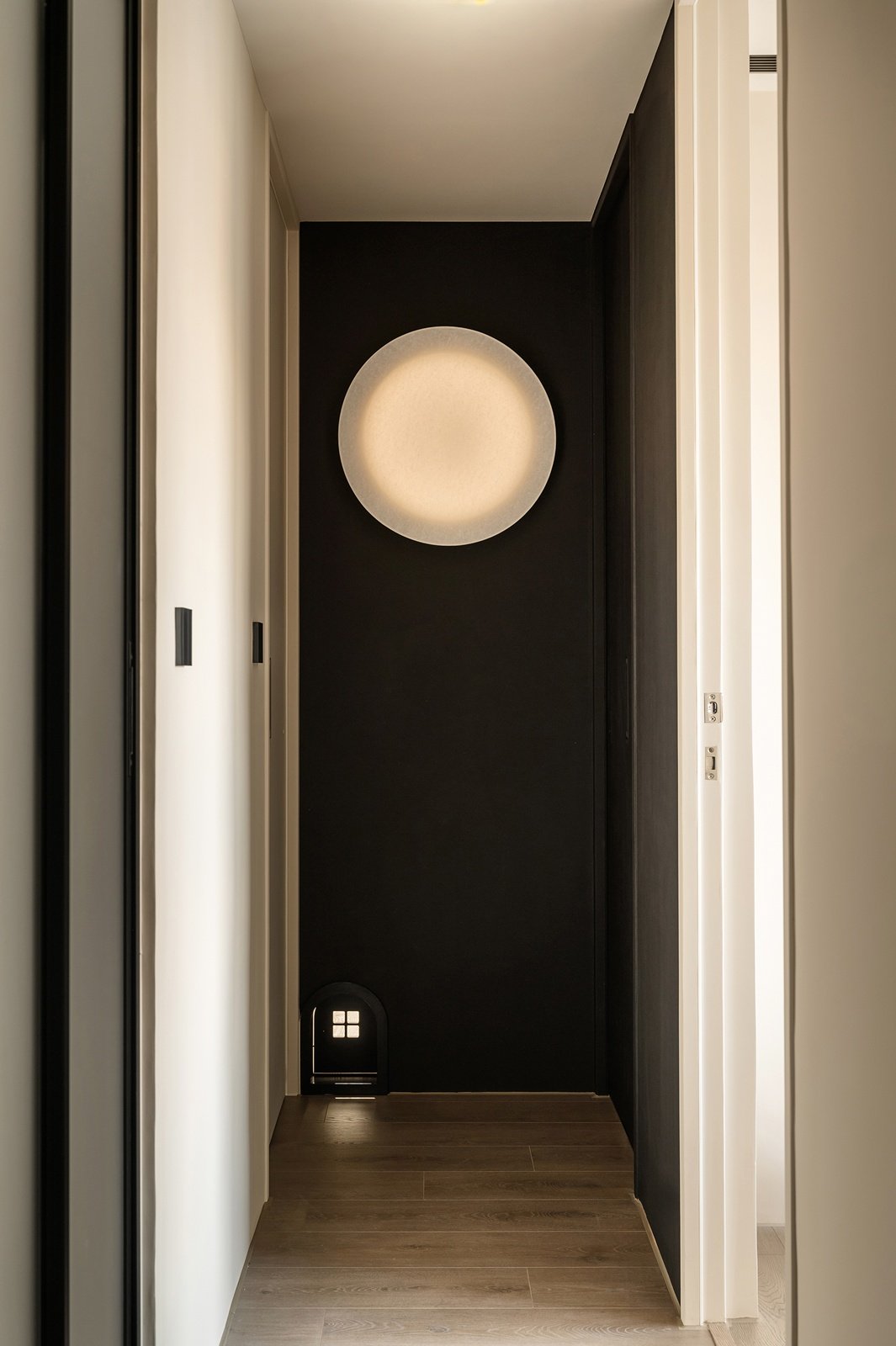 走廊端景以黑牆與圓形壁燈相映,如夜空中一輪明月,同時設置貓門方便貓咪自由穿梭。主臥透過開放式層架與架高床提升收納彈性,與浴室以拱形開口自然過渡。洗手台結合化妝桌的配置,搭配藝術漆牆面,營造柔和光感與細膩質地。客衛浴以粉色水磨石搭配銀色五金,展現清爽俐落的復古氣息。