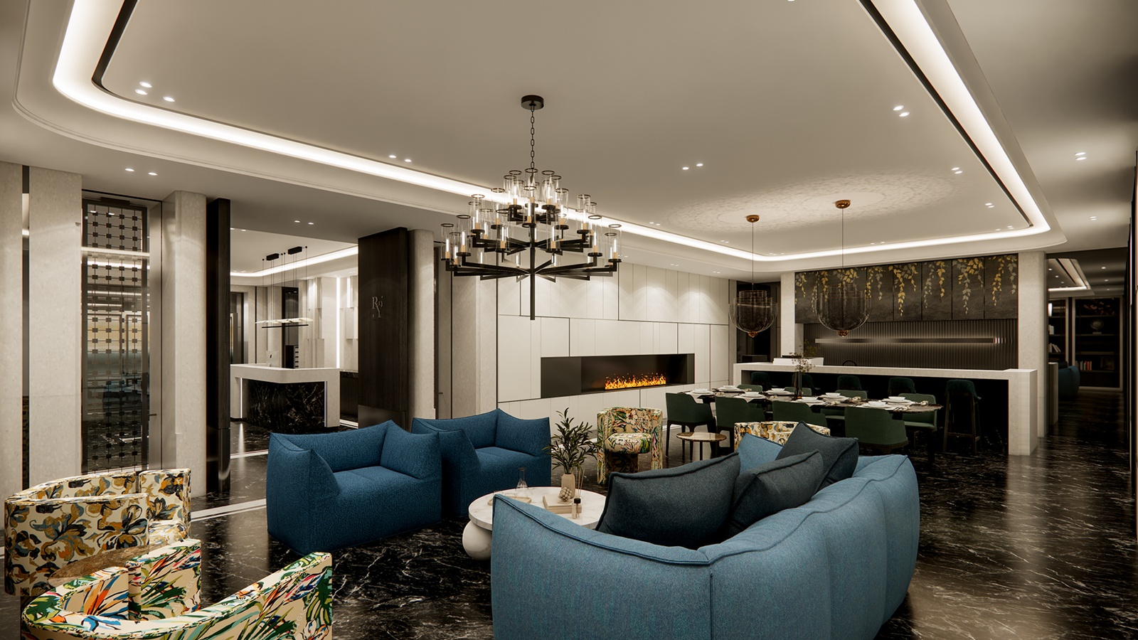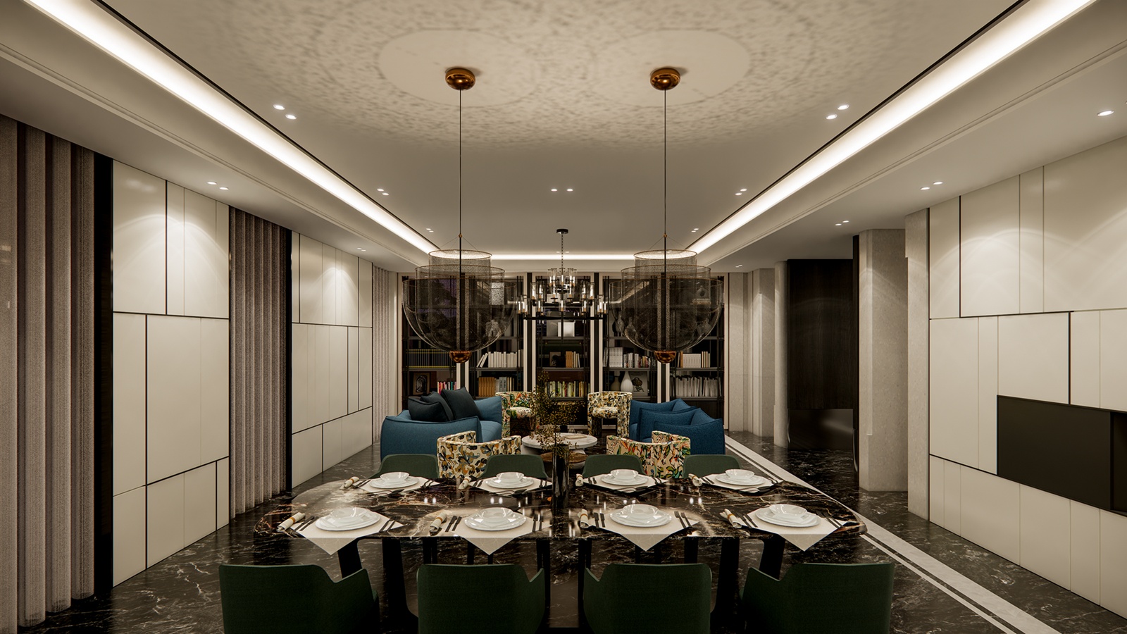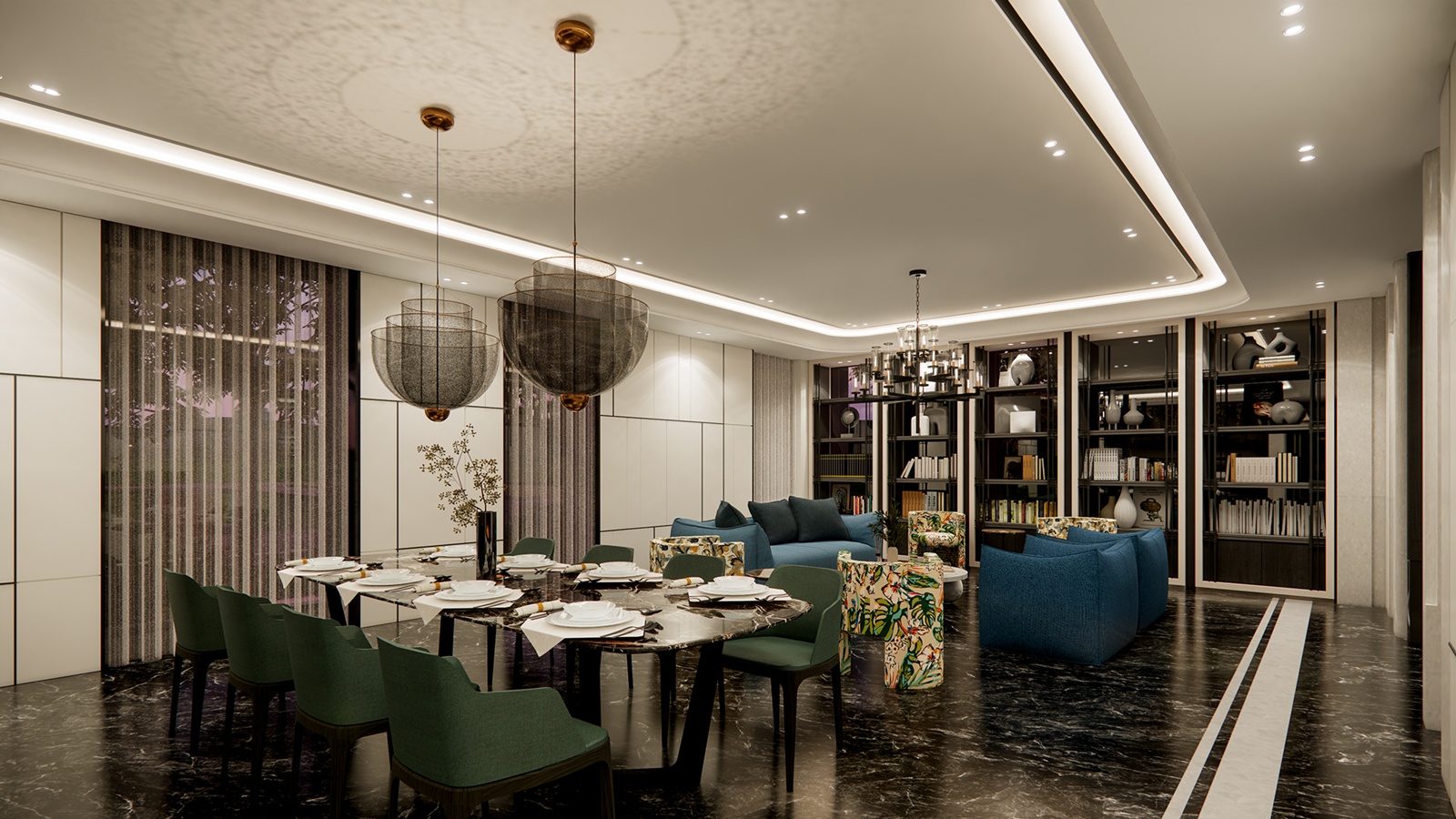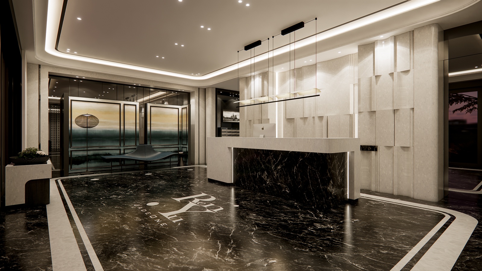 由主要入口大廳進入,黑白對比的石材奠定明確的迎賓基調,牆面透過一致尺度的立體分割,形成穩定的立面節奏。主題 LOGO 作為辨識元素,嵌入石材、木皮與金屬之中,引導動線而不干擾整體美學。交誼廳承接大量自然採光,弧形天花消除銳角陰影並均勻柔化光線。淺色牆面與深色地坪構成穩定基底,軟裝家具選用具東方文化意涵的織品,隱約回應法國藝術史中東西交融的意境。在接近私領域的門廳與梯廳,刻意收斂曲線與裝飾,僅保留法式線板的比例精神,並轉譯為立體牆面分割,搭配金屬細節與間接照明,使垂直動線在功能之外,亦具清晰節奏,進而強化公私領域轉折處的銜接秩序。