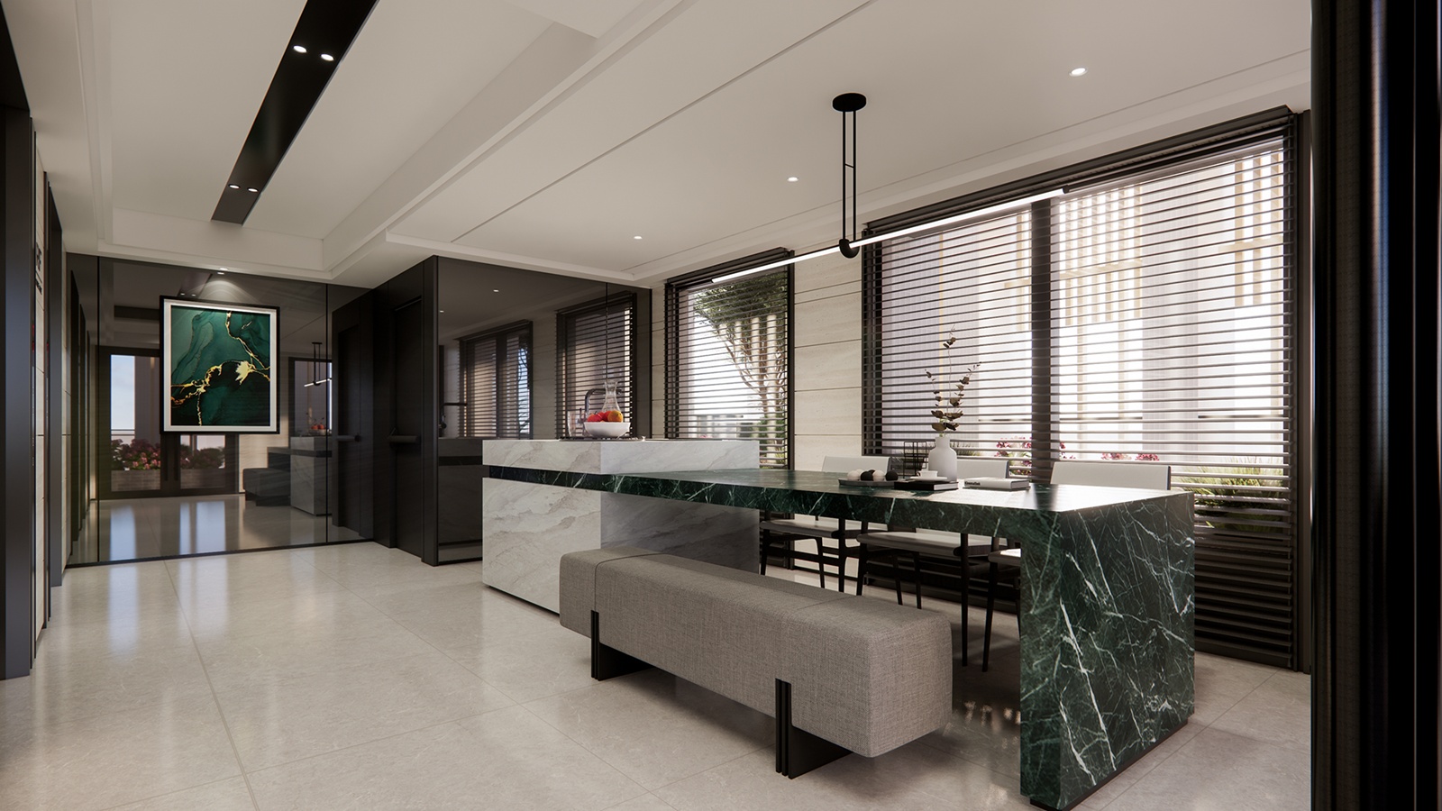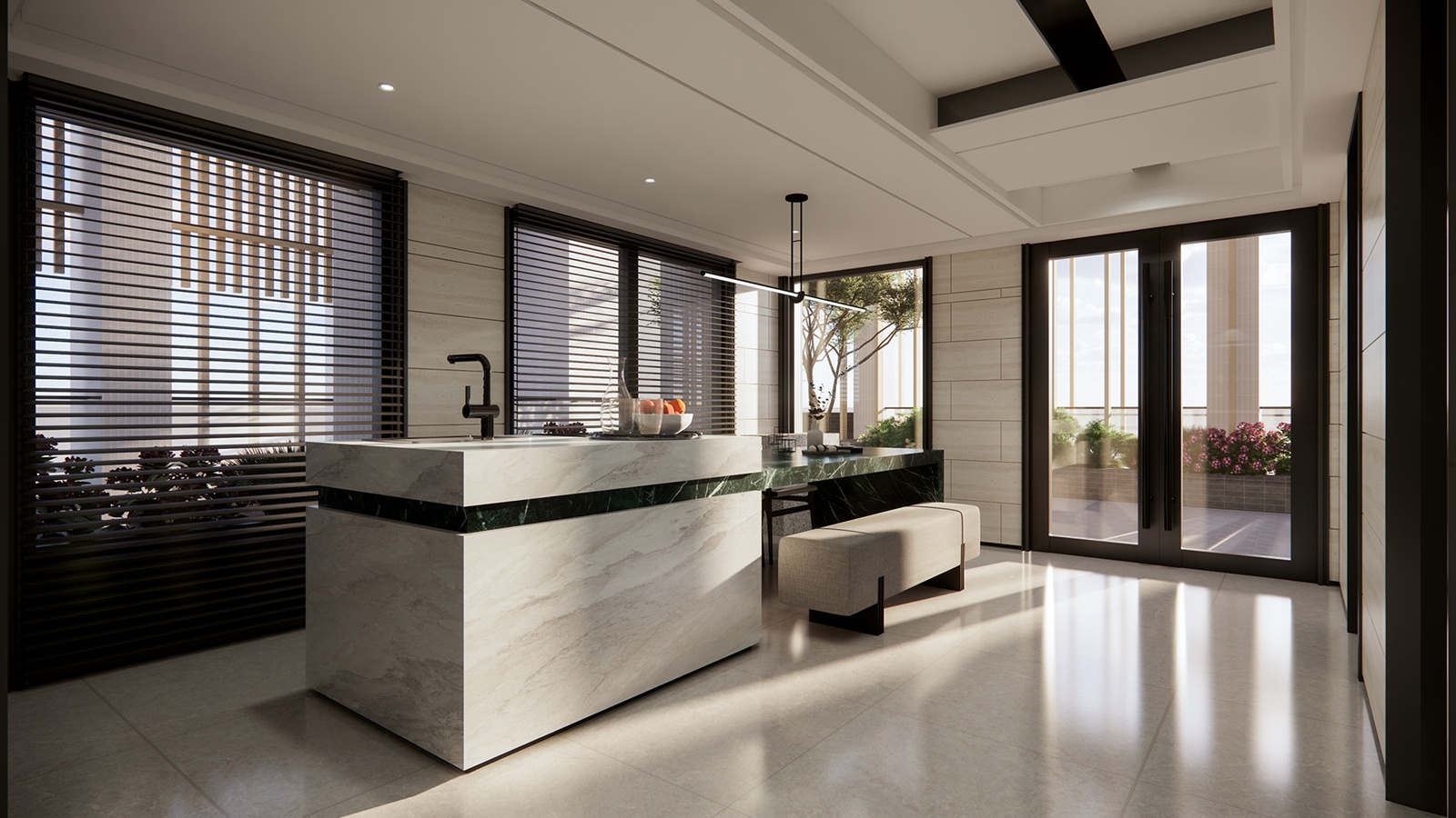 在永續與人文層面上,藉由自然採光的最大化、低干擾照明配置與耐久材料的選用,降低長期使用的能耗與維護負擔。公設同時成為交流與停留的共享場域,使法式輕奢在日常中被感知,讓居者察覺光線與時間的變化。