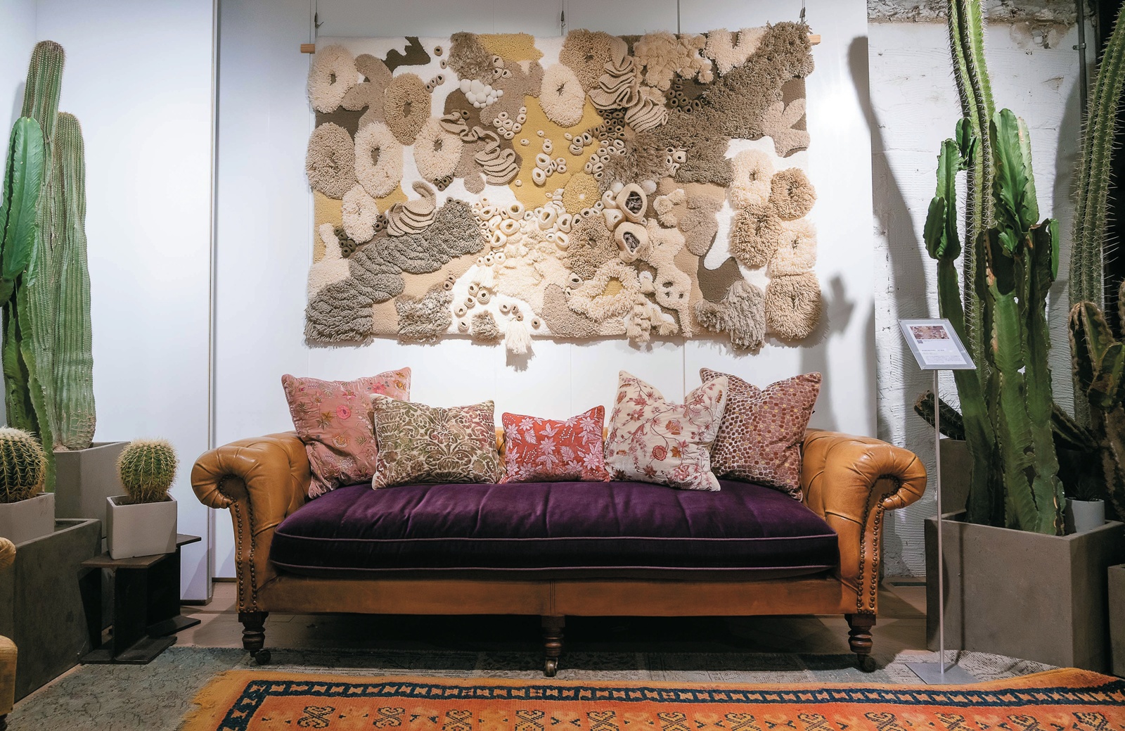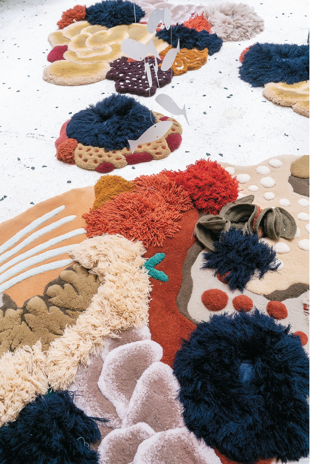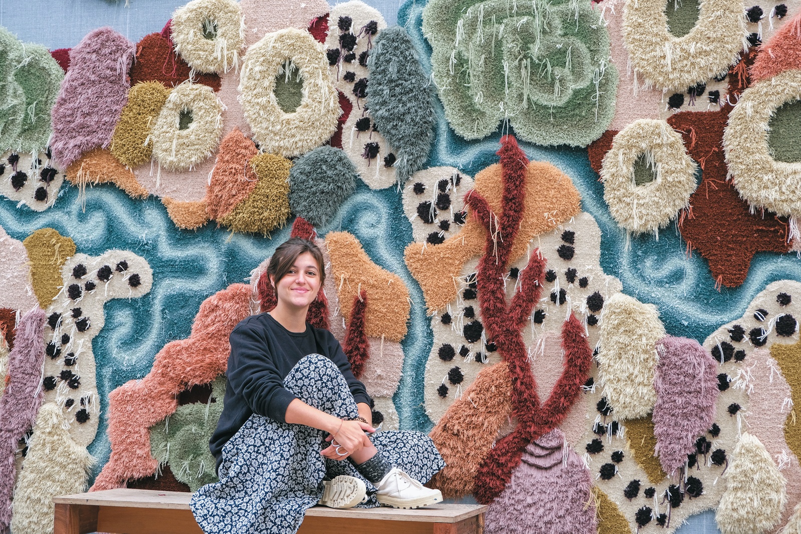 藝術家Vanessa Barragão 從小在海邊長大,與海洋的連結成為她源源不絕的創作靈感來源,然而不斷升高的海水溫度、工業污染等,正一步步的威脅著她最熱愛的海洋,也因此,她希望能透過作品喚醒大家對海洋生態的重視。Vanessa 擅長運用再生原料及環保素材詮釋出獨一無二的華麗掛毯,工廠廢棄的紗線,經過她的巧手可以幻化成美麗的海底世界。她以地毯繡、手簇、鉤針編織、流蘇花邊等傳統手工藝技法,表現出海底各種型態,富有層次及立體感的表現手法,繽紛的用色,將海底的樣貌詮釋得栩栩如生。其大膽而極具藝術性的創作受到各方青睞,多次受邀為展覽、室內空間領域打造織物裝置作品。因為對自然環境與環保再生的重視,Vanessa 在創作時運用了一系列再生以及天然素材,例如工廠廢棄的紗線,這是Vanessa 到當地紡織工廠工作後發現許多原料在生產過程中被浪費了,因此就和工廠溝通將不用的廢棄紗線收集起來加以洗滌整理之後進行藝術創作。除此之外,在工廠她也發現了其他環保素材,例如Lyocell ( 天絲),這是一種溶解性纖維,對於環境不會造成負擔。天然原料也是Vanessa 的創作材料來源,包括羊毛、竹子到接下來希望可以進一步研發的一系列素材。