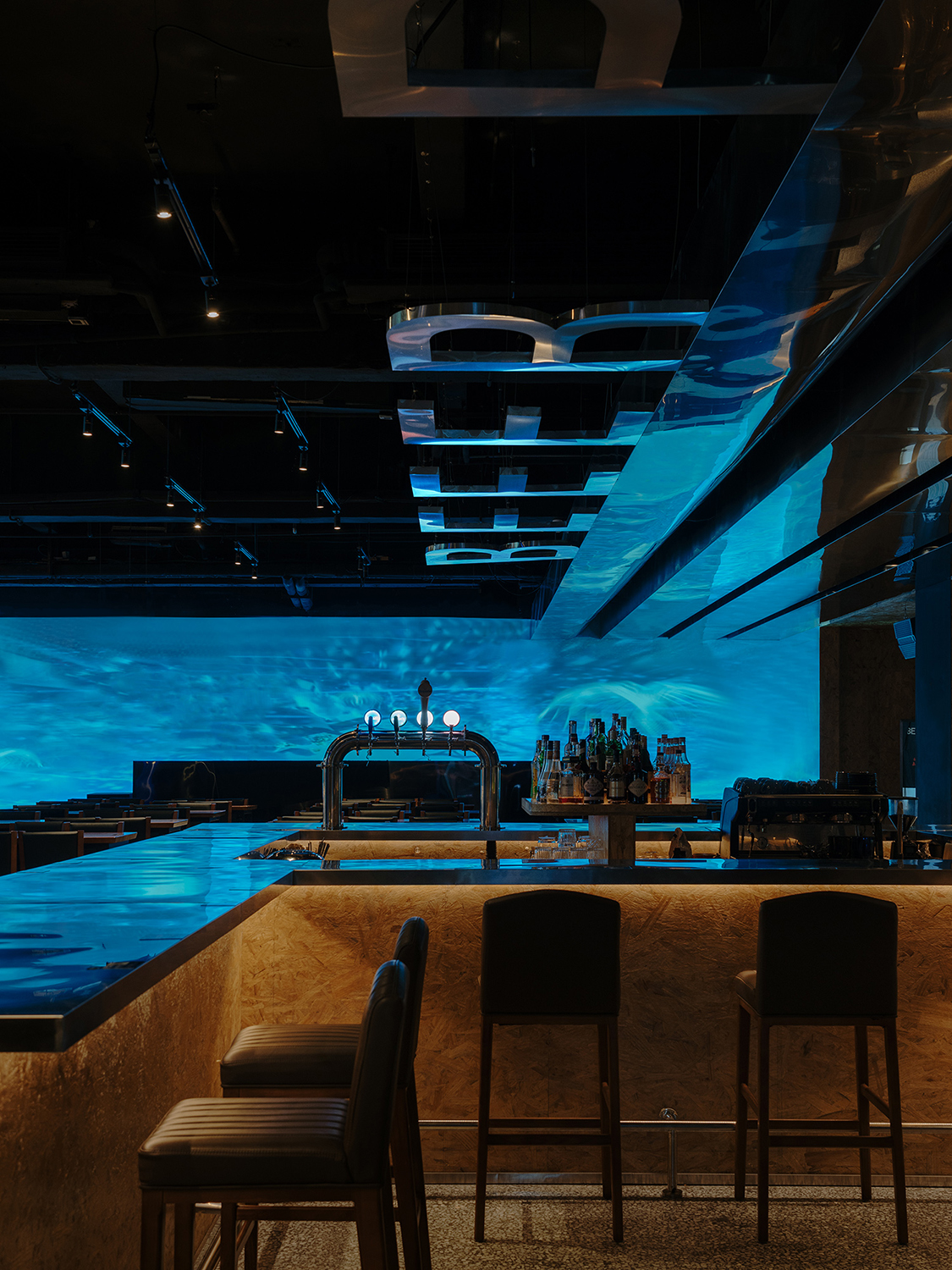 在大氣的深藍色休息室裡,一個像夕陽一樣的燈光藝術裝置,一個準備櫃檯變成了一個舞台,廚師們在Patricia Urquiola舒適的扶手椅上的食客的注視下準備創造性的米其林星級美食。