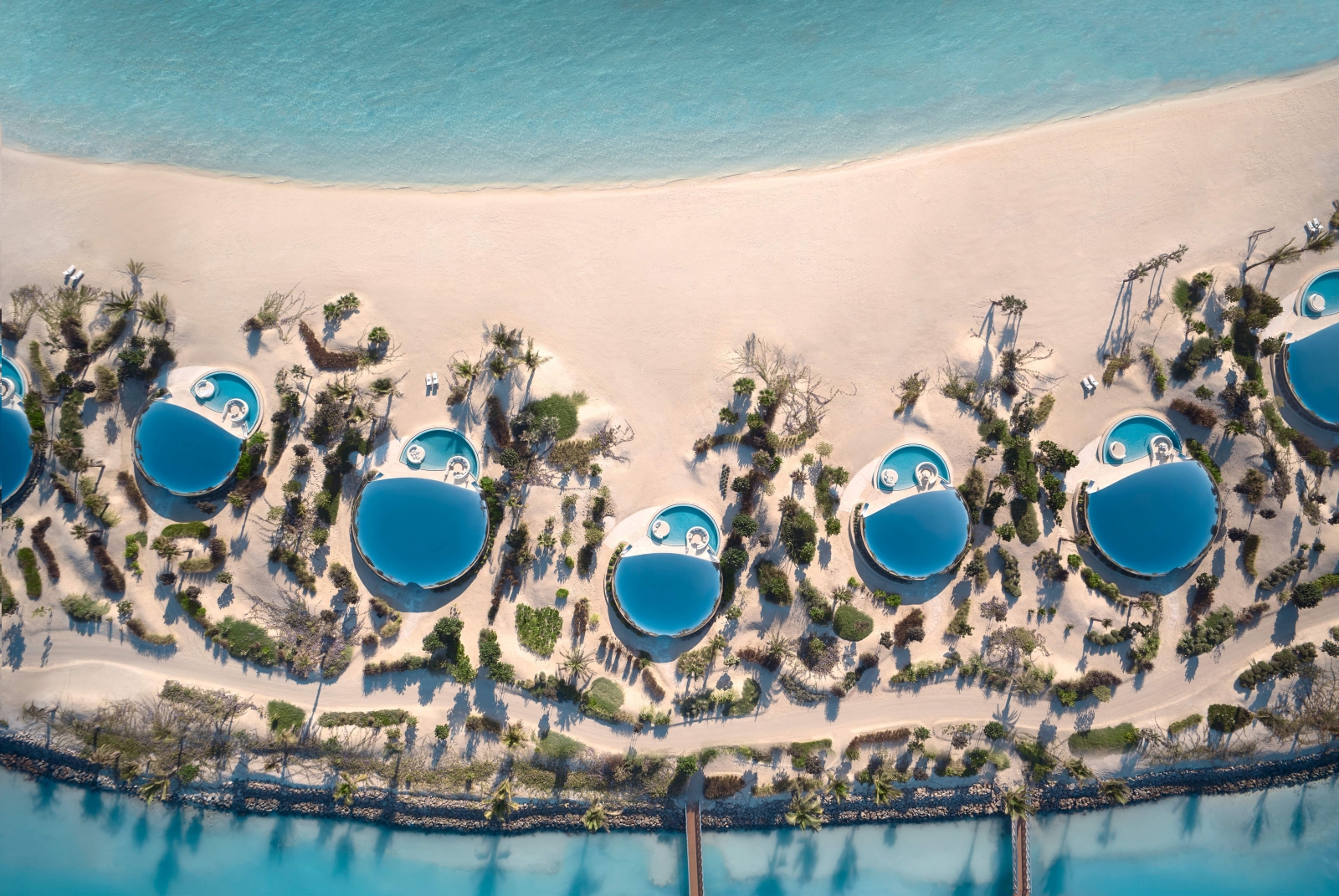 謝巴拉度假村(Shebara)坐落於沙烏地阿拉伯紅海群島中的謝巴拉島,是一處僅設有73間客房的超豪華生態度假村。此計畫由紅海環球開發,作為再生奢華的先驅典範,與「2030 願景」相互呼應,致力於打造一座完全離網、淨零排放的度假勝地,在保護並提升全球最原始海洋環境之一的同時,重新定義高端旅宿的可能性。度假村規劃一至四臥的水上與沙灘別墅,並配置精緻餐飲、水療與康體設施、私人海灘,以及分齡設計的家庭與成人泳池,營造兼具隱私與舒適的度假體驗。賓客僅能搭乘水上飛機或私人遊艇抵達,進一步強化遠離塵囂的靜謐氛圍;島上全面採用全電動交通系統,確保零排放移動,並透過專屬管家服務,為每位旅人量身打造深度個人化的旅程。