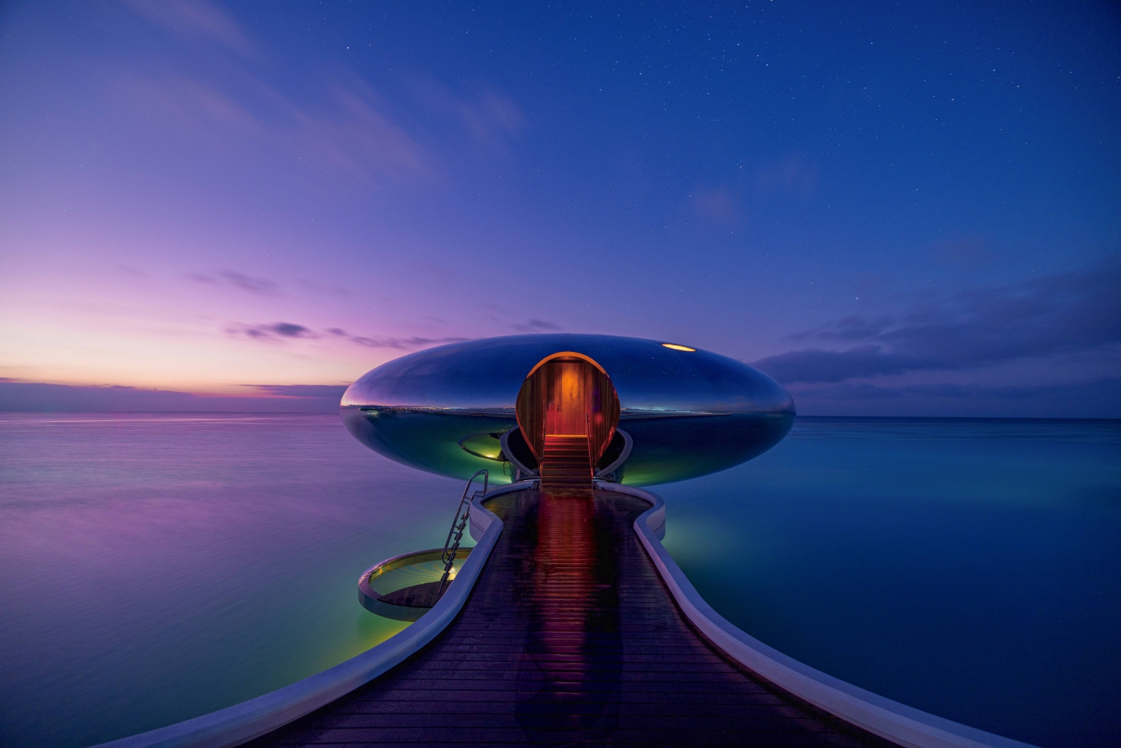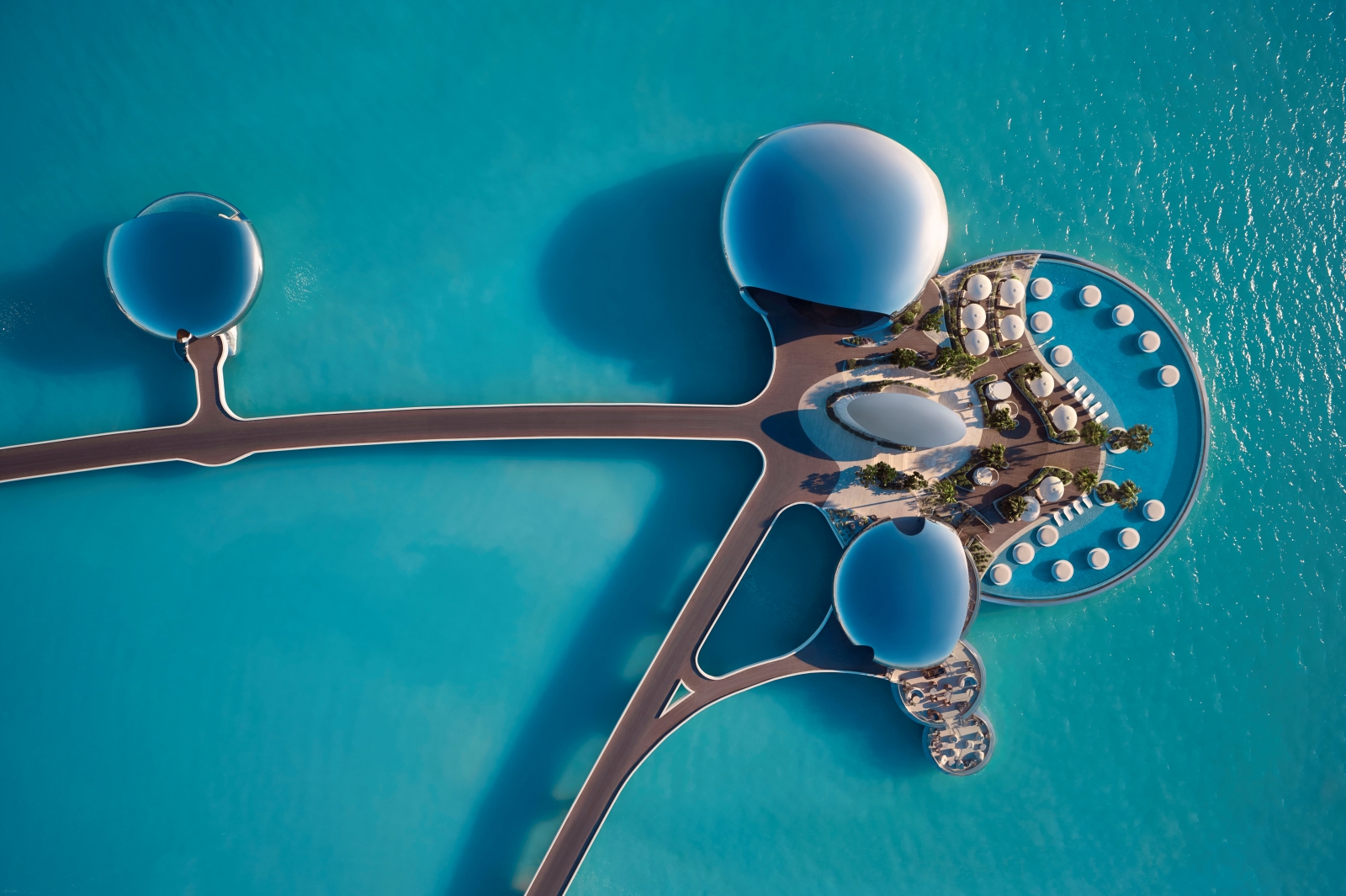 建築設計汲取島嶼自然景觀為靈感,回應碧波海色、綿延沙岸與遼闊天際線的節奏。不鏽鋼打造的水上別墅被塑造成漂浮於海面的球體,如同珍珠懸浮其上,隨光線與海色變化映射出細膩而流動的光影。所有建築皆以毫米級精度定位,避免對陸地與海床造成干擾,並採用鋼樁結構取代疏浚或混凝土基礎,將對自然的影響降至最低。永續理念貫穿整體規劃,太陽能微電網提供百分之百再生能源,無需仰賴柴油發電;用水來自太陽能海水淡化系統,廢水就地循環再利用,固體廢棄物則透過堆肥或再製實踐零廢棄目標。建築材料,特別是船用級不鏽鋼,皆以耐用、可回收與低碳為核心考量。