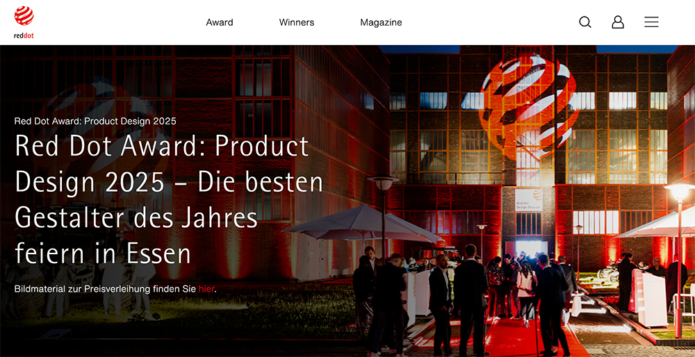 紅點設計大獎是由德國設計協會Design Zentrum NRW於1955年創辦,紅點設計大獎主席彼得.賽克博士教授,自1991年起一路帶領紅點,至今紅點標誌已廣受國際認可,成為優秀設計的代名詞。考量設計領域豐富多元,為求評選的審慎與專業,紅點設計大獎特意將獎項區分為:紅點產品設計大獎、紅點傳達設計大獎,以及紅點設計概念大獎三大獎項,每個獎項皆為每年舉辦一次,因此,無論是產品設計、傳達設計、包裝設計到設計概念和原型,紅點都完整掌握時下全球的重要設計趨勢。