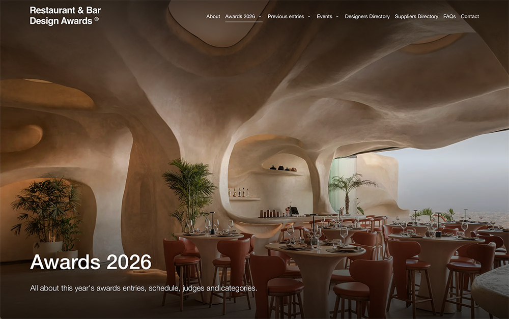 餐廳和酒吧設計大獎是一個全球公認的致力於食品和飲料空間的設計。涵蓋了從船隻到機場,博物館,漢堡,甚至米其林星級餐廳,每一個可想像的空間。該獎項吸引了來自英國和全球的世界頂尖設計師,酒店老闆和評審。近期的包括Zaha Hadid,Kengo Kuma,Foster&Partners,Stephen Alden,Gordon Ramsay,Tony Chambers(Wallpaper*總編輯),Alberto Alessi, Thomas Heatherwick等等。