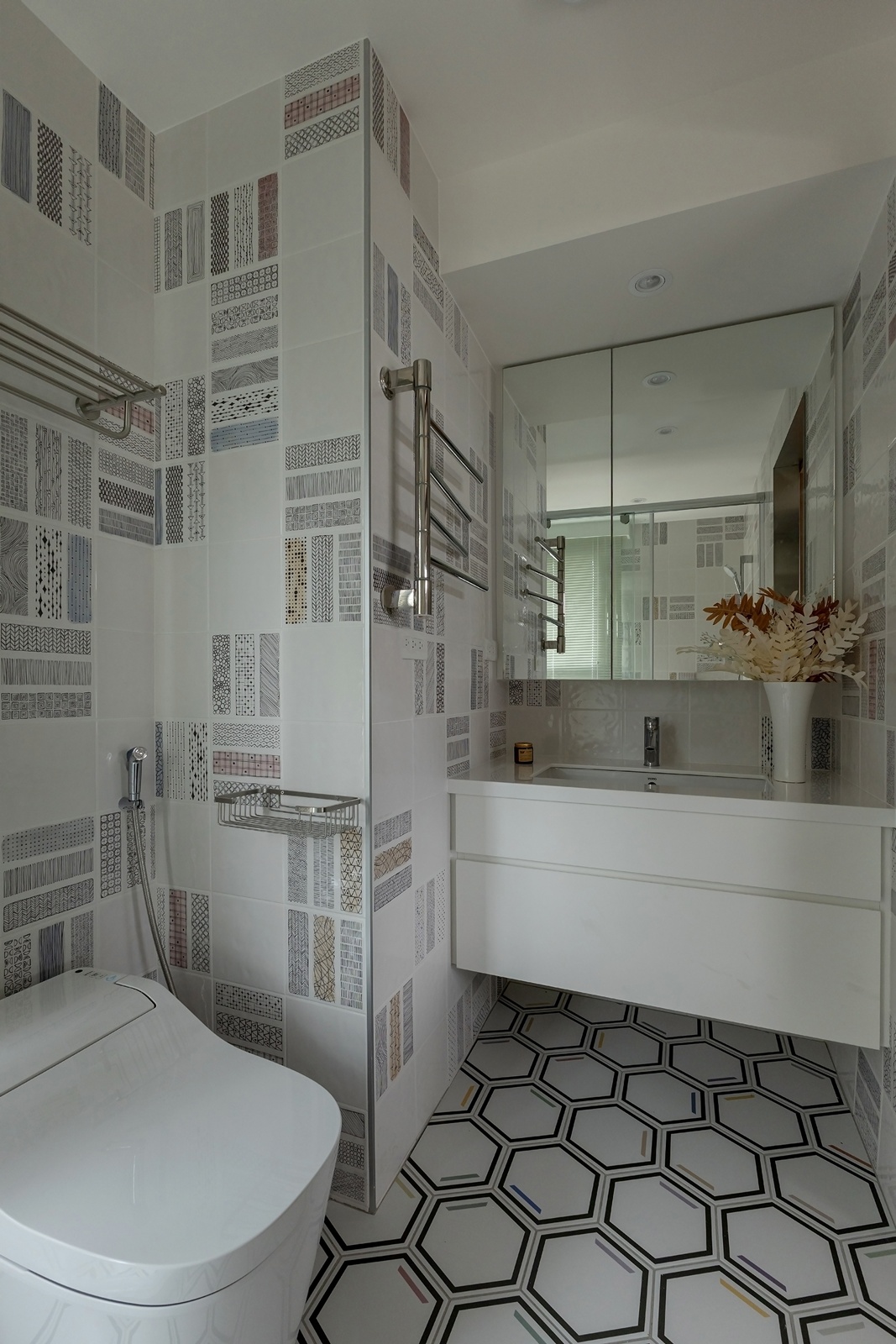 私領域延續整體語彙,更衣區採玻璃隔間與開放層架,輔以間接照明,柔光勾勒出清爽而溫暖的氛圍。主臥床頭垂直木格柵營造安定氣息,衛浴以圖騰磁磚與六角地磚構成現代節奏,細節中注入個性與生活感。