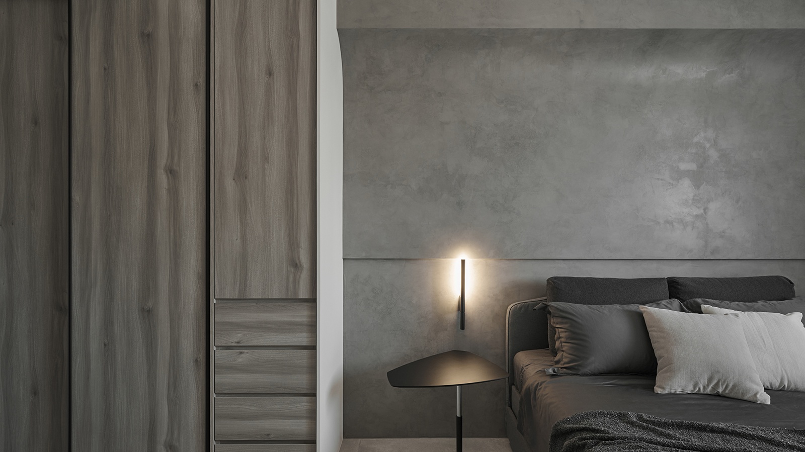 私領域延續低彩度主調,並透過溫潤木皮家具,打造溫馨的空間氛圍。另外,設計精選仿大理石薄板磚,展現細膩紋理與現代質感,為空間注入豐富層次與精緻美學。