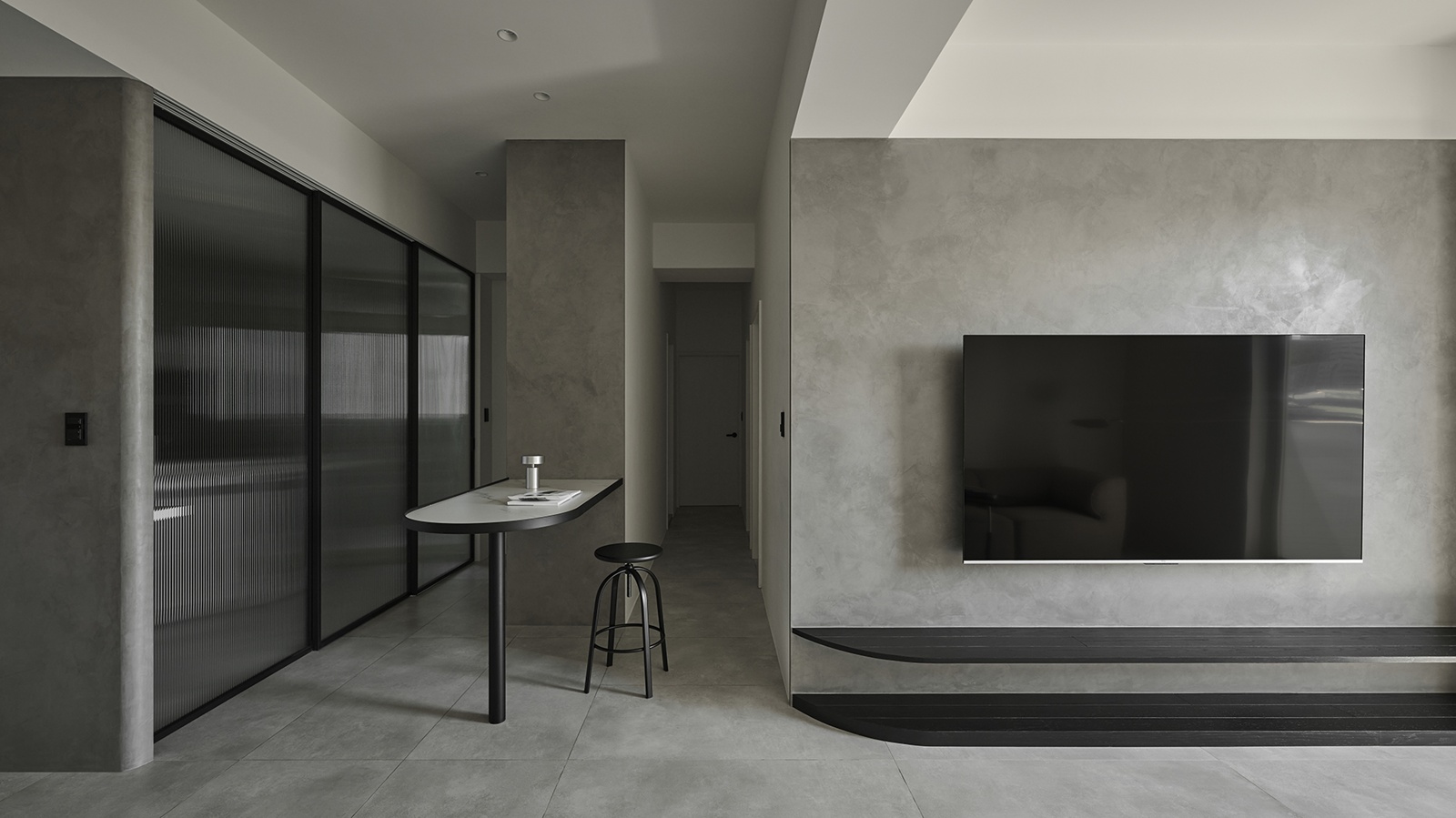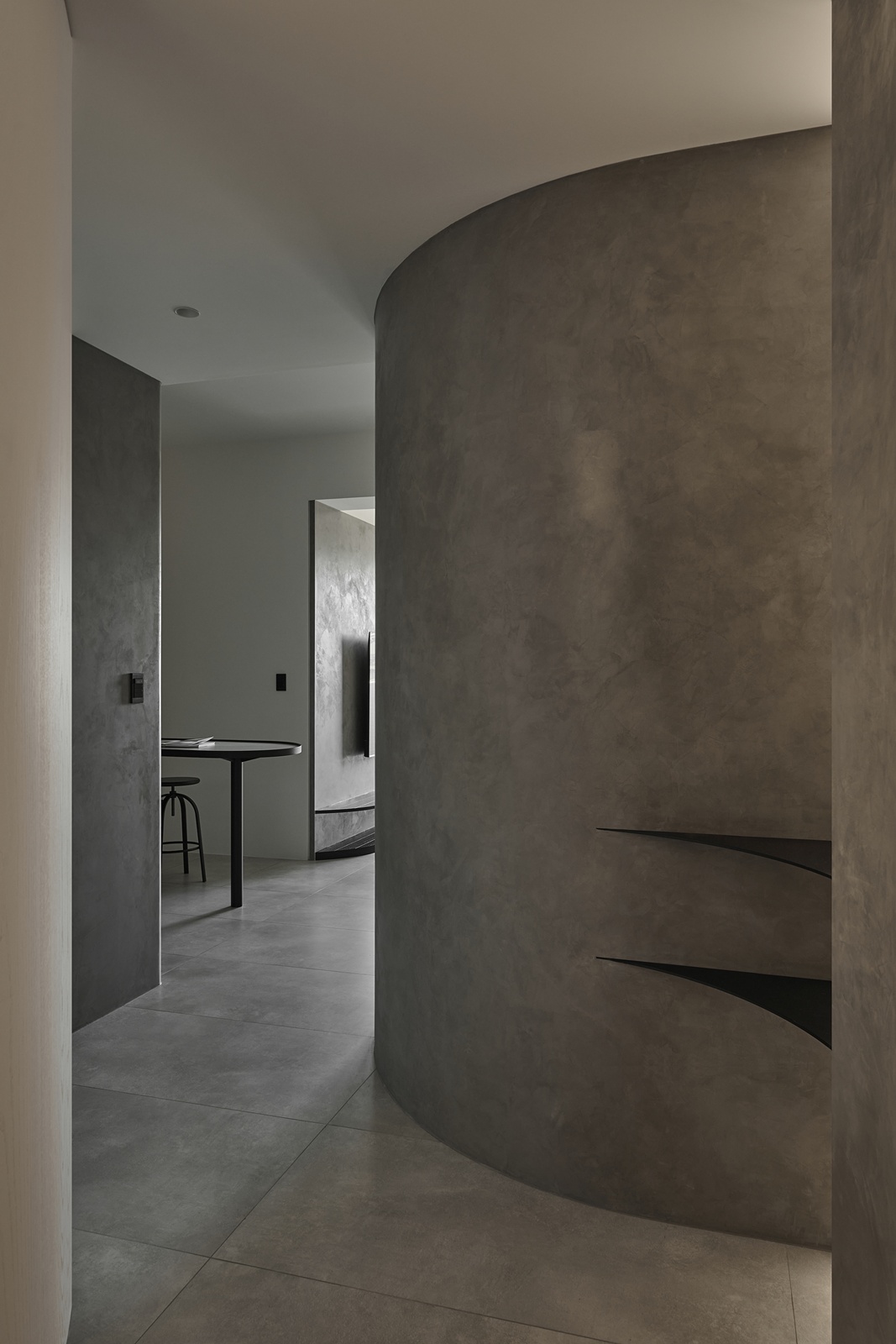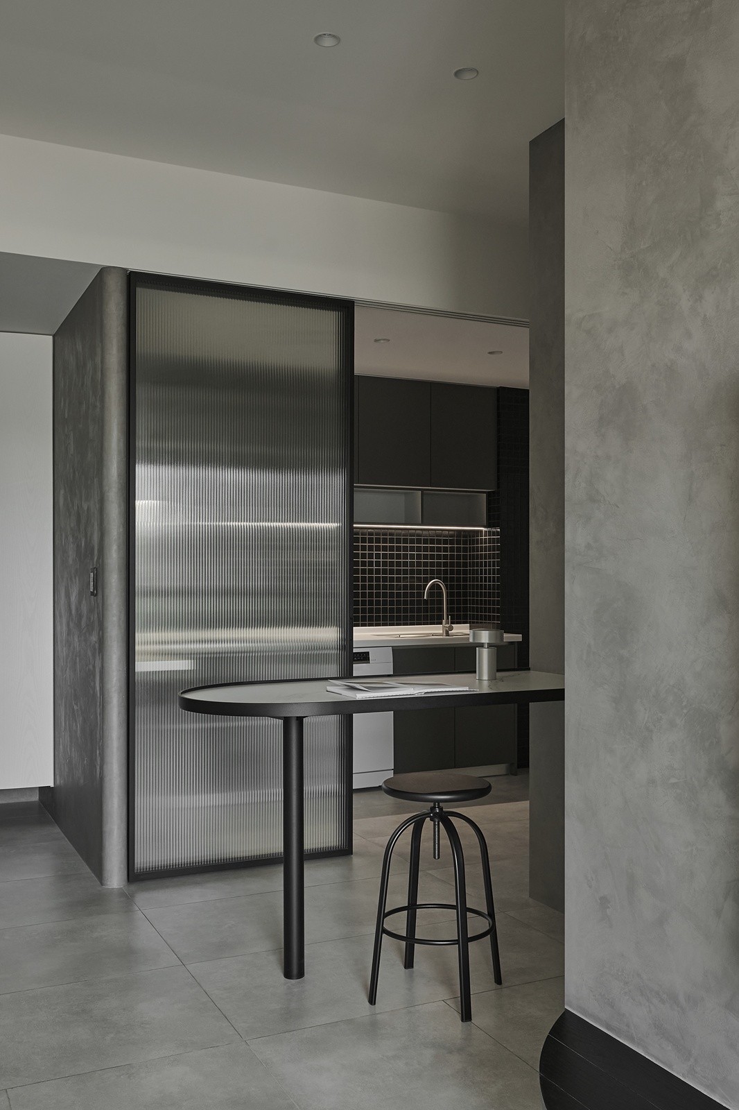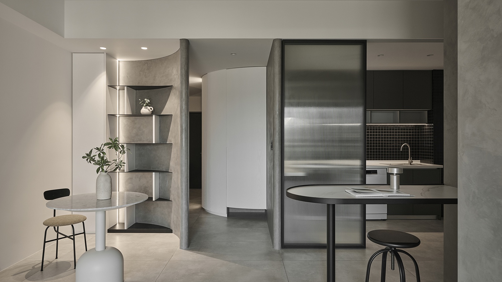 公領域以電影中的隧道為靈感,精心規劃動線與視線,巧妙呼應屋主對隱私的重視,使廊道成為連結外界與室內的過渡之境,將居宅幻化為城市的靜心之所。此外,採用隱藏式收納櫃體,維持純粹俐落的立面表情,而清水模肌理則承載光影變化,賦予空間沉靜氣韻。開放式格局亦是設計亮點之一,團隊將餐廳、客廳與吧檯以三角關係串聯,兼具便利性與視覺延展。不僅如此,廚房門扉選用長虹玻璃,於隱私與通透間取得優雅平衡;轉角櫃體設計則將空間效用最大化,並以流暢線條呼應整體語彙,映照屋主樸實真切的氣質。