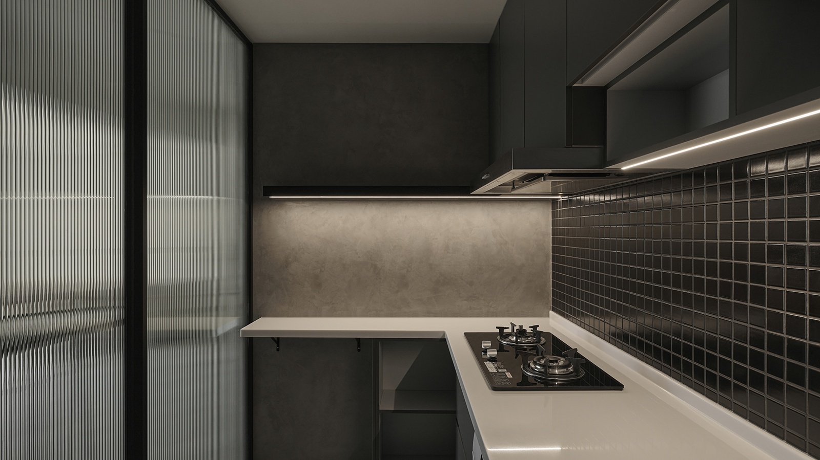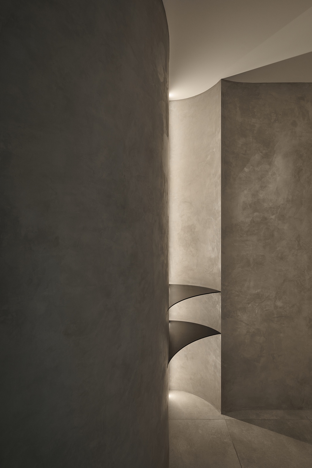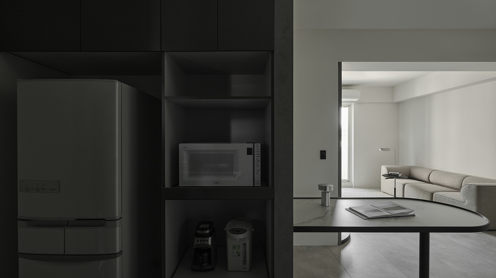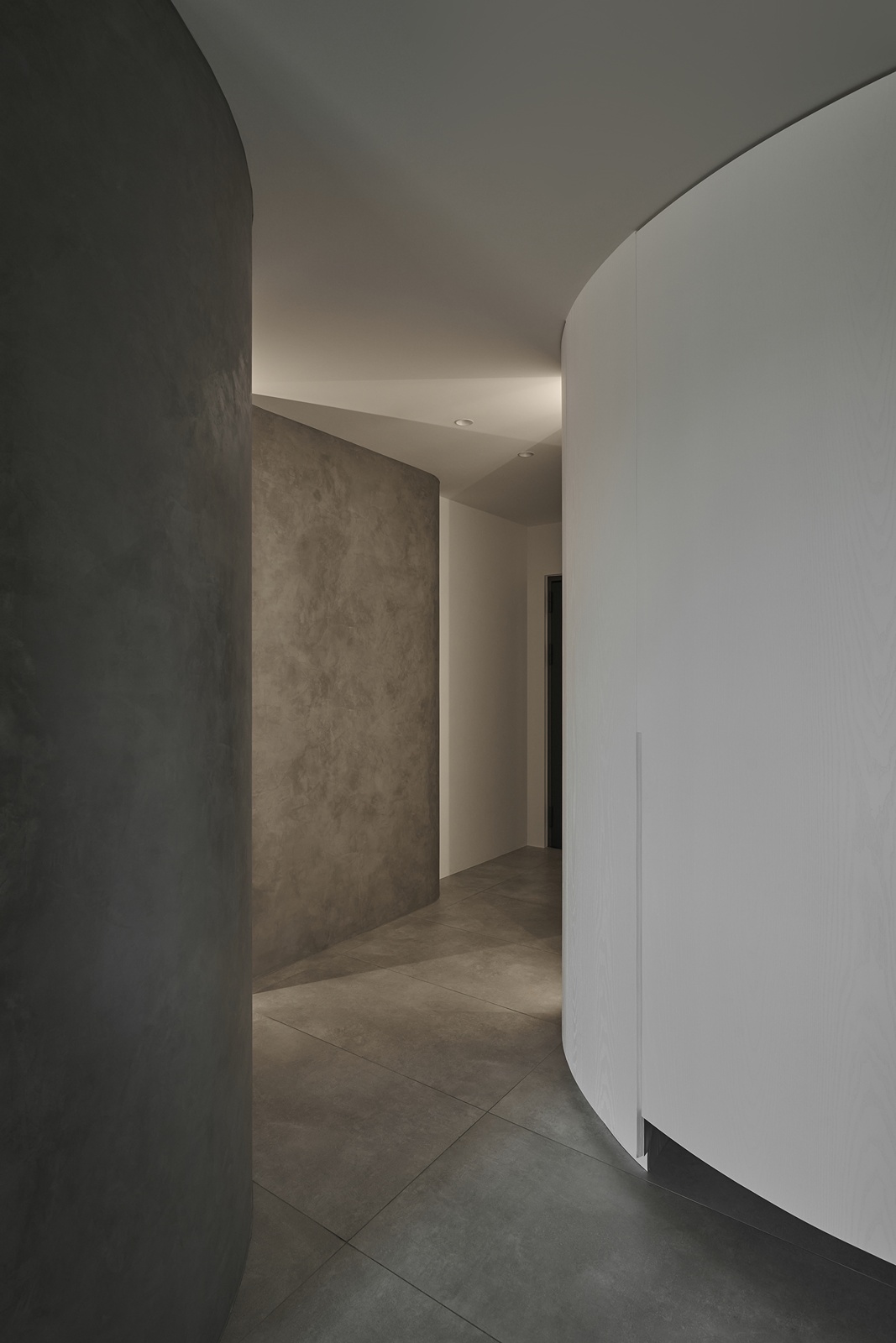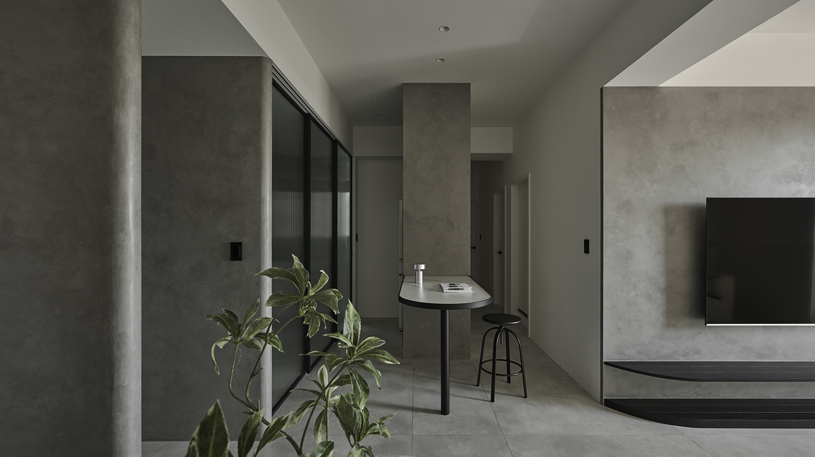 公領域以電影中的隧道為靈感,精心規劃動線與視線,巧妙呼應屋主對隱私的重視,使廊道成為連結外界與室內的過渡之境,將居宅幻化為城市的靜心之所。此外,採用隱藏式收納櫃體,維持純粹俐落的立面表情,而清水模肌理則承載光影變化,賦予空間沉靜氣韻。開放式格局亦是設計亮點之一,團隊將餐廳、客廳與吧檯以三角關係串聯,兼具便利性與視覺延展。不僅如此,廚房門扉選用長虹玻璃,於隱私與通透間取得優雅平衡;轉角櫃體設計則將空間效用最大化,並以流暢線條呼應整體語彙,映照屋主樸實真切的氣質。