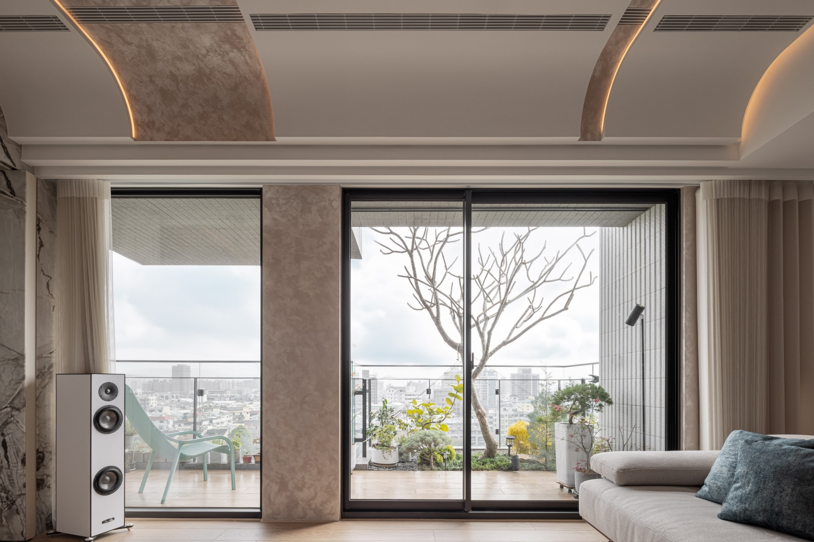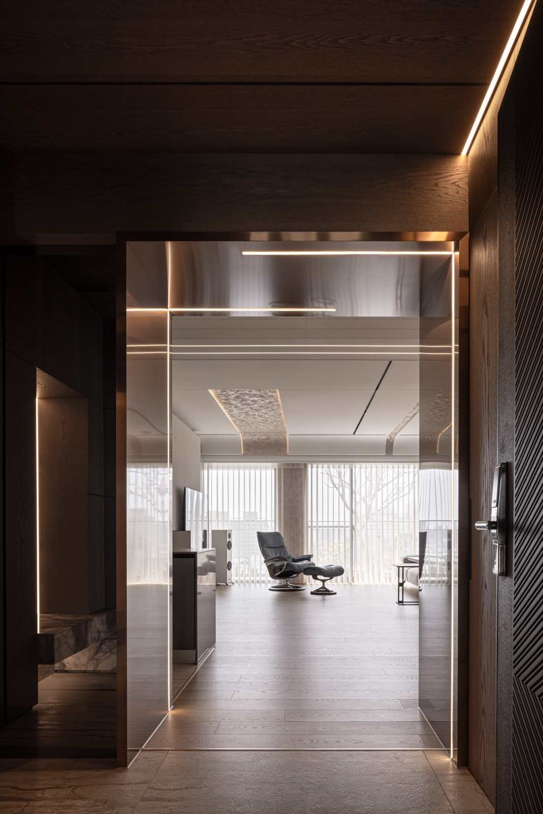 本案座落於城市中的靜謐高樓,在坪數有限的條件下,設計旨在將戶外開闊的城市景觀納入室內,讓自然光線與景致成為生活的主角。以簡潔現代的設計筆觸,引入大理石、木皮、鍍鈦鐵件等元素,構築出兼具實用機能與美學品味的都會住宅。