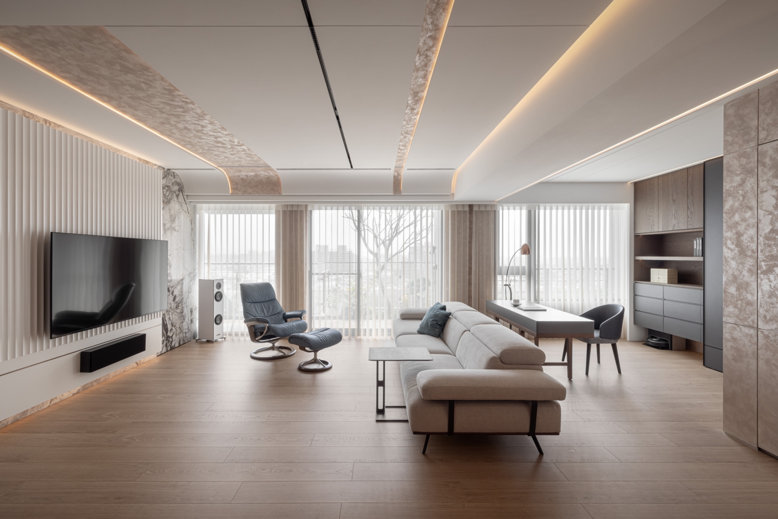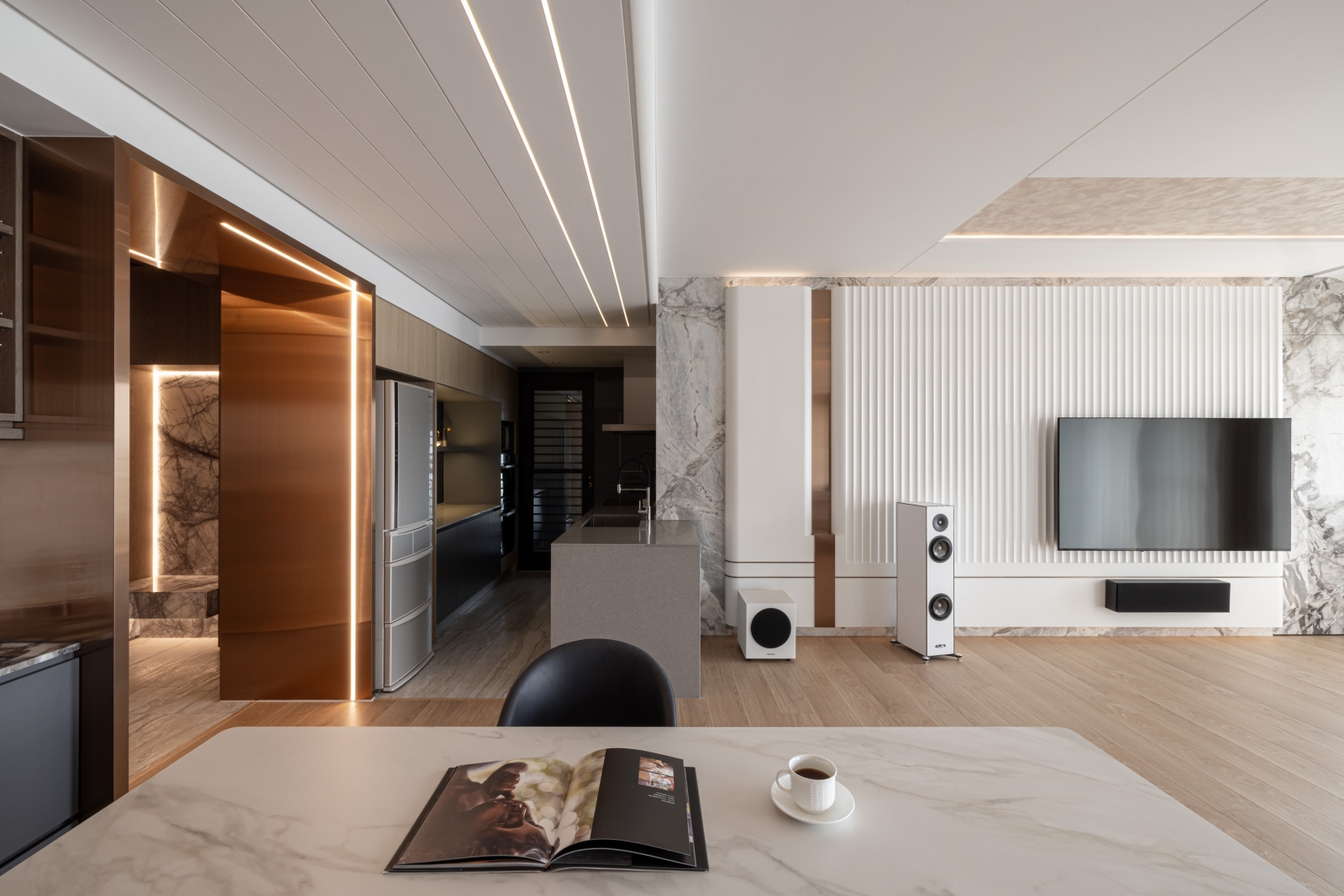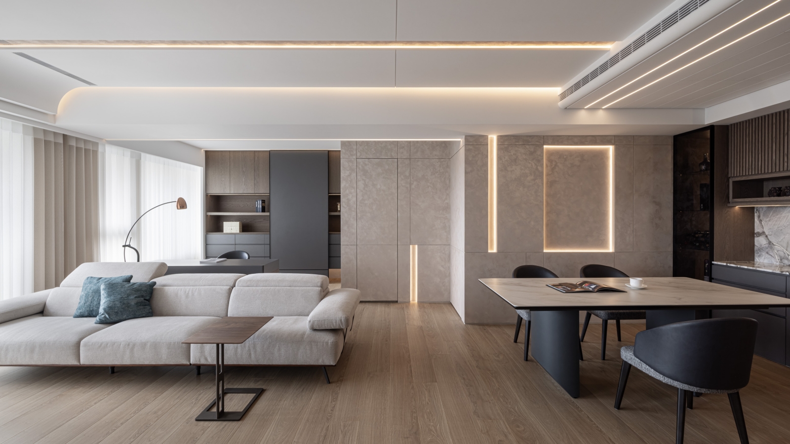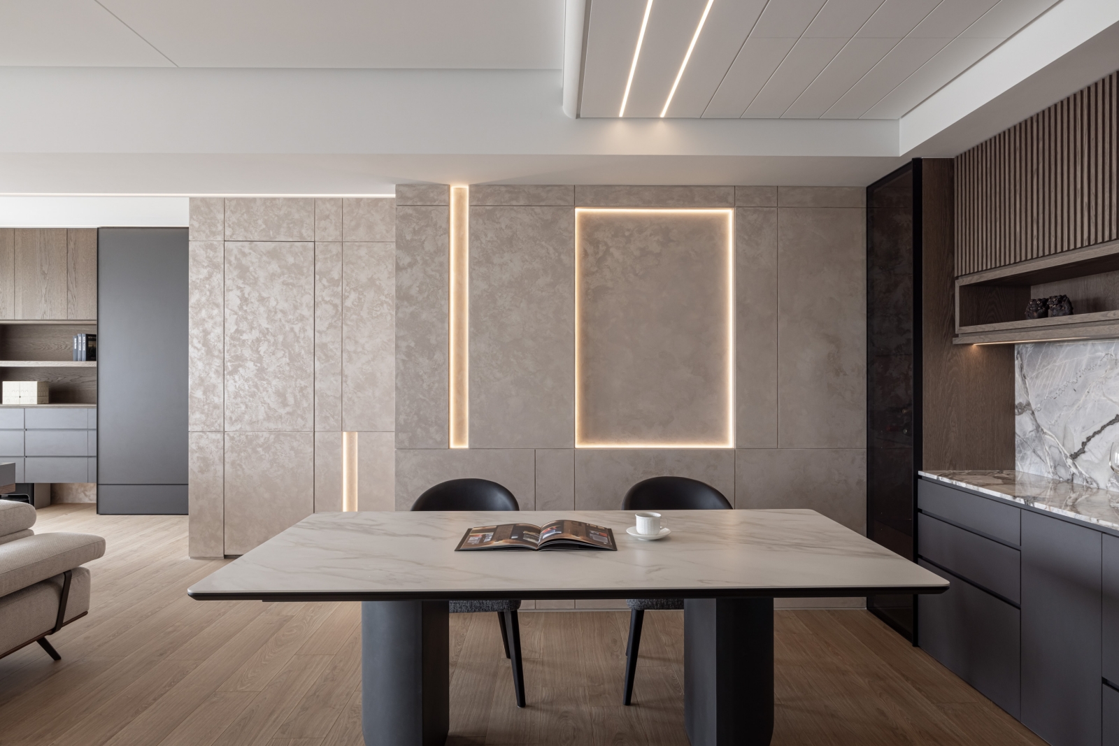 客廳電視主牆採用白色凹凸造型壁板,與溫潤的大理石相互呼應,創造出層次豐富的立面表情。通往臥室的入口巧妙隱藏於大理石牆面之中,維持了整體視覺的簡潔統一。客廳一隅的書桌區身兼閱讀與辦公雙重功能,以深色木質與深灰色櫃體形成微妙的區域劃分。餐廳後方使用藝術塗料形成掛畫牆面,在燈光勾勒下形成工整線條美學。天花板以優雅弧線延展,搭配全室線性照明設計,帶來溫馨舒適的氛圍。