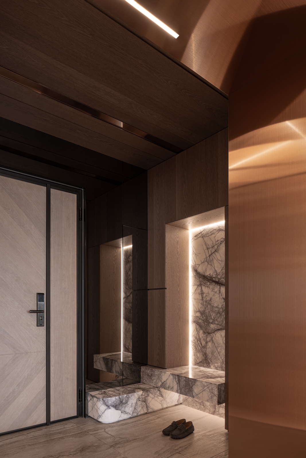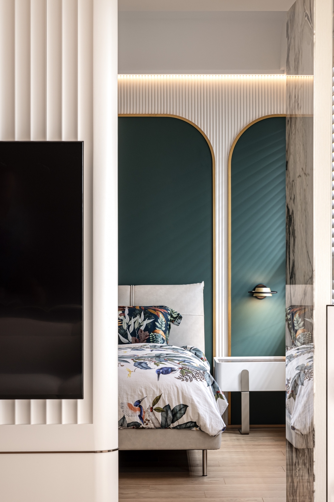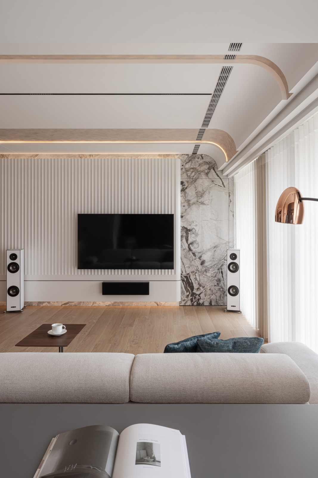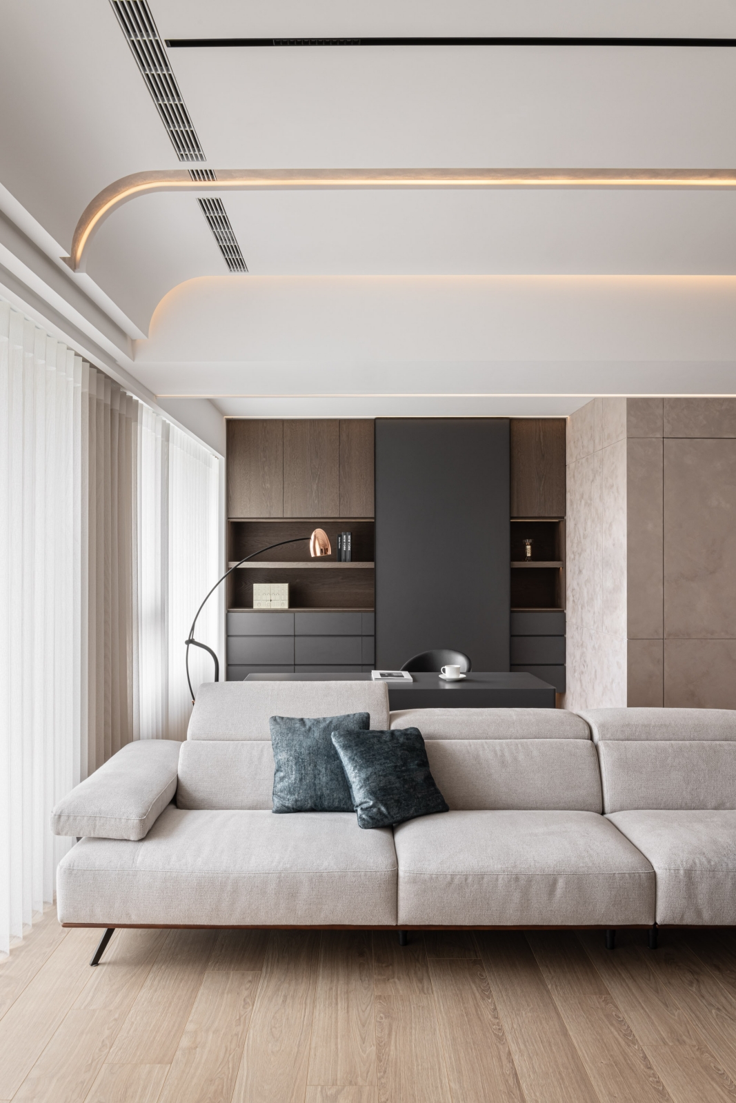 客廳電視主牆採用白色凹凸造型壁板,與溫潤的大理石相互呼應,創造出層次豐富的立面表情。通往臥室的入口巧妙隱藏於大理石牆面之中,維持了整體視覺的簡潔統一。客廳一隅的書桌區身兼閱讀與辦公雙重功能,以深色木質與深灰色櫃體形成微妙的區域劃分。餐廳後方使用藝術塗料形成掛畫牆面,在燈光勾勒下形成工整線條美學。天花板以優雅弧線延展,搭配全室線性照明設計,帶來溫馨舒適的氛圍。
