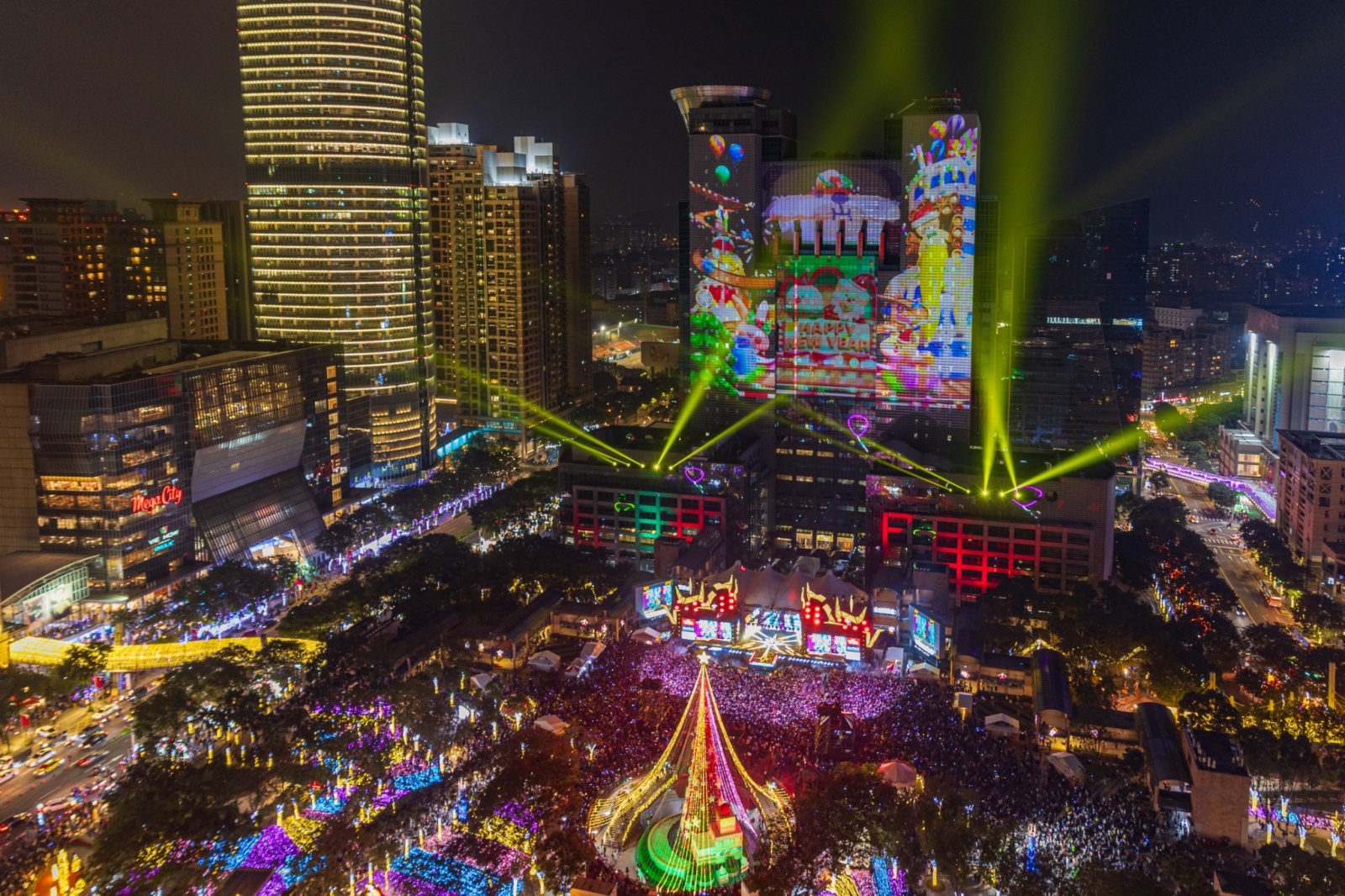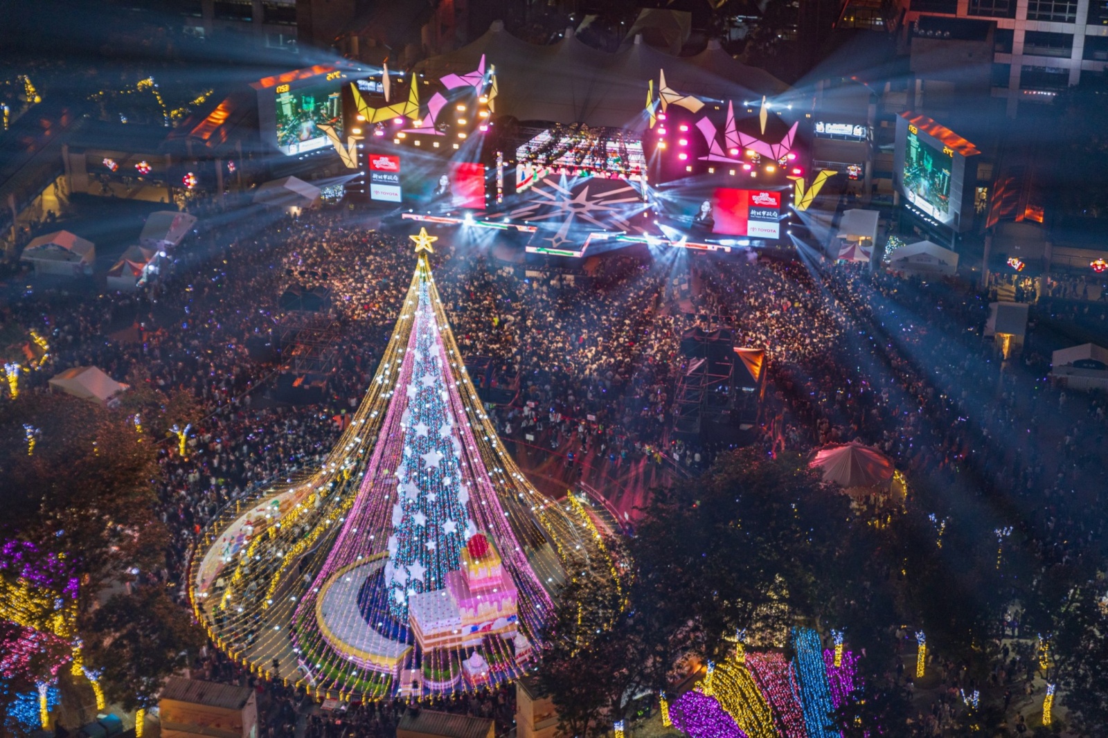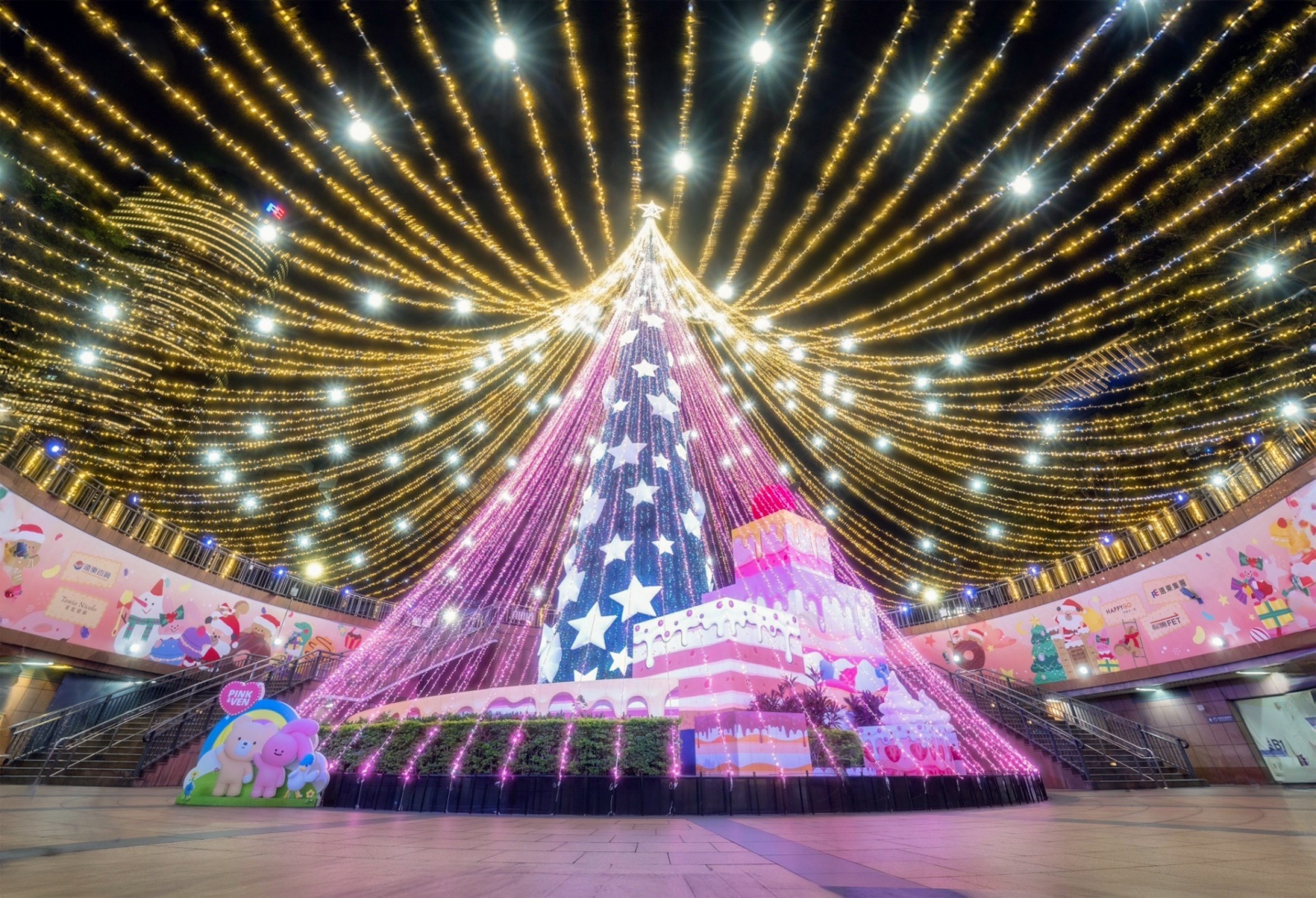 值得一提的是,本次活動中佇立在市民廣場的大型耶誕樹,是特地採天幕式的燈飾設計所打造而成。主體是以抹茶蛋糕的型態作為設計發想,再利用雙層薄紗的天幕式燈飾設計加以點綴,呈現出如同灑在蛋糕上的糖霜意象,使其既能傳遞出「甜蜜幸福」的寓意,又能藉由絢爛奪目的光點照亮都市夜空,令人沉浸在夢幻的光影中,享受別於以往的耶誕氛圍。此外,本次光雕投影秀更是跳脫往年只能局限在市府大樓主牆的表現形式,改採創新的「裸視3D投影技術」,並搭配高彩度雷射線條燈、染牆燈、桑塔熊造型逐格燈條以及天幕式耶誕樹的連動設計,不僅能大幅增加動畫展演的故事性與互動性,更成為了歷年以來最大的戶外沉浸式體驗。