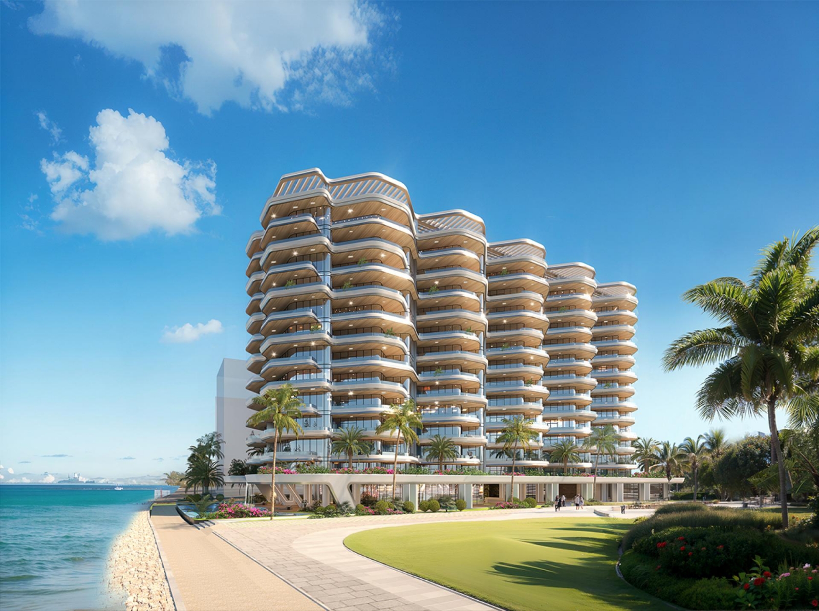Built on the central islet in the manmade archipelago of Al Marjan, Sunshine Bay is a sailboat-themed residential development standing 13 storeys tall and facing the vast Persian Gulf.