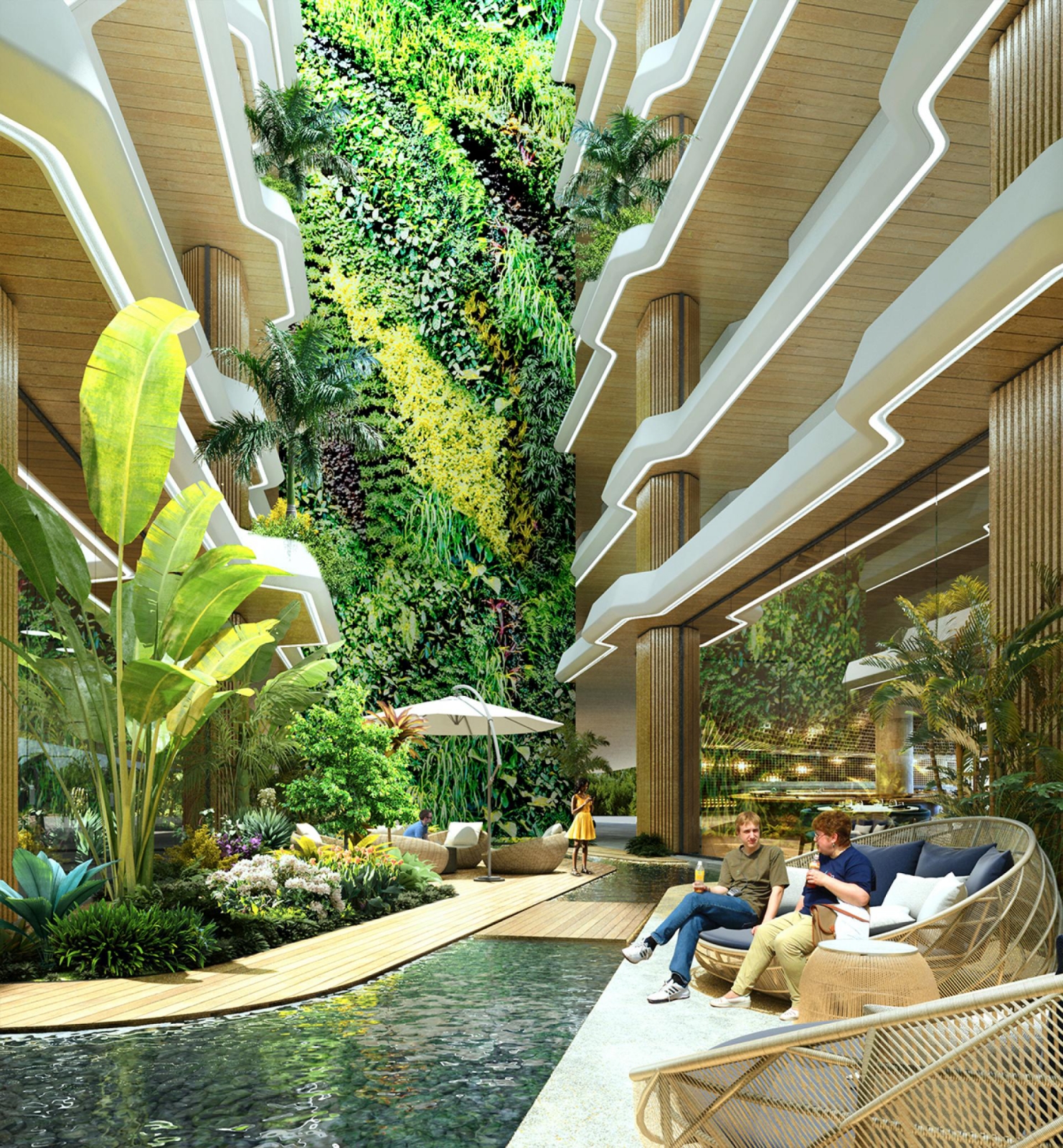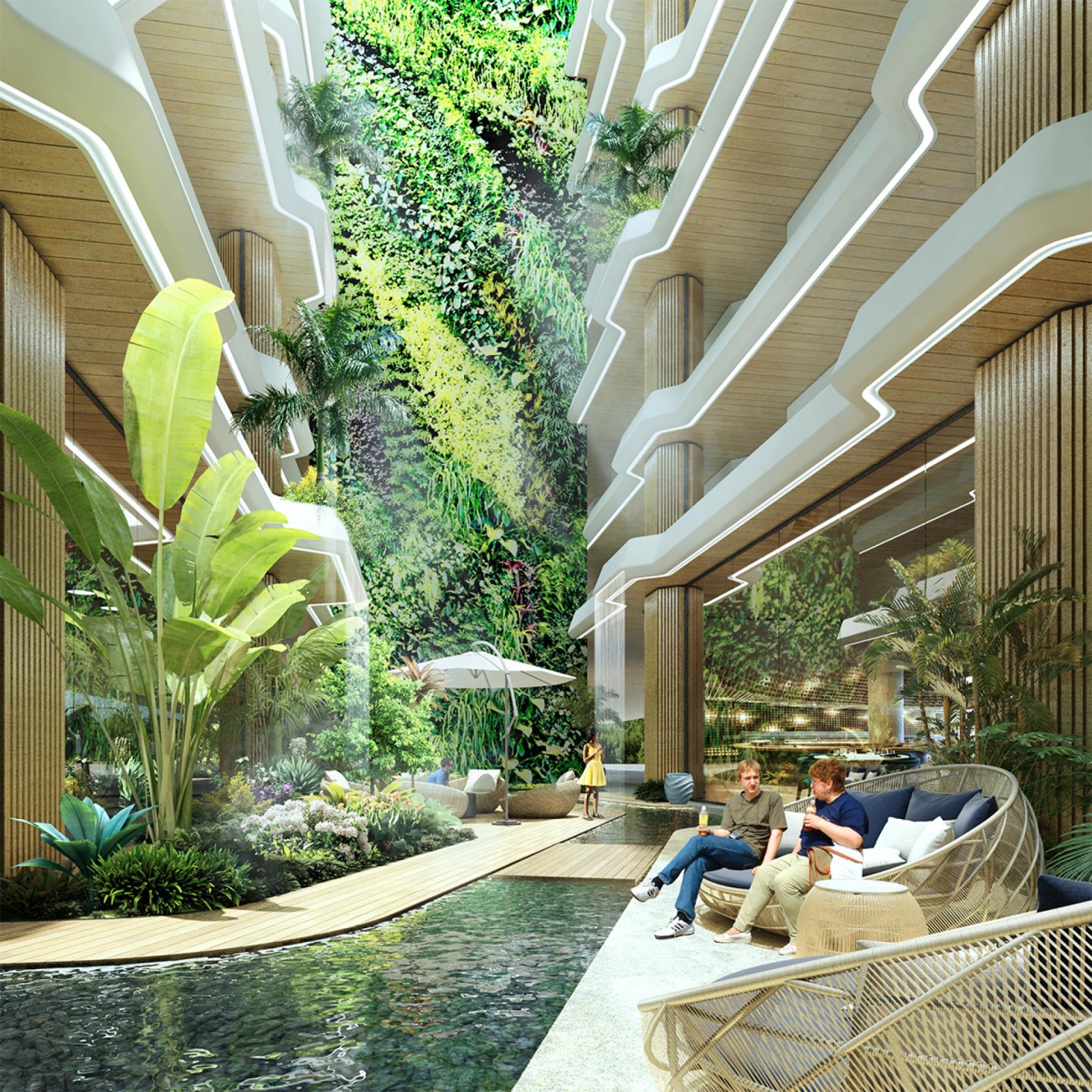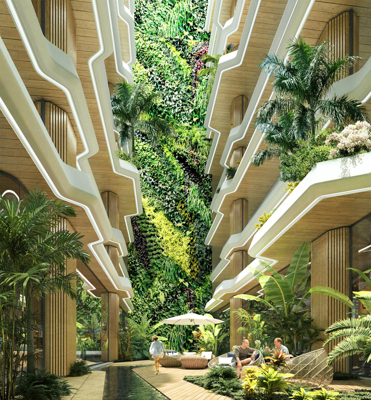Its ground floor houses a lobby, which opens up to an atrium whose green-clad landscaping extends upwards across all levels, aiding in the vertical distribution of oxygenated air and creating a more pleasant interior climate.
