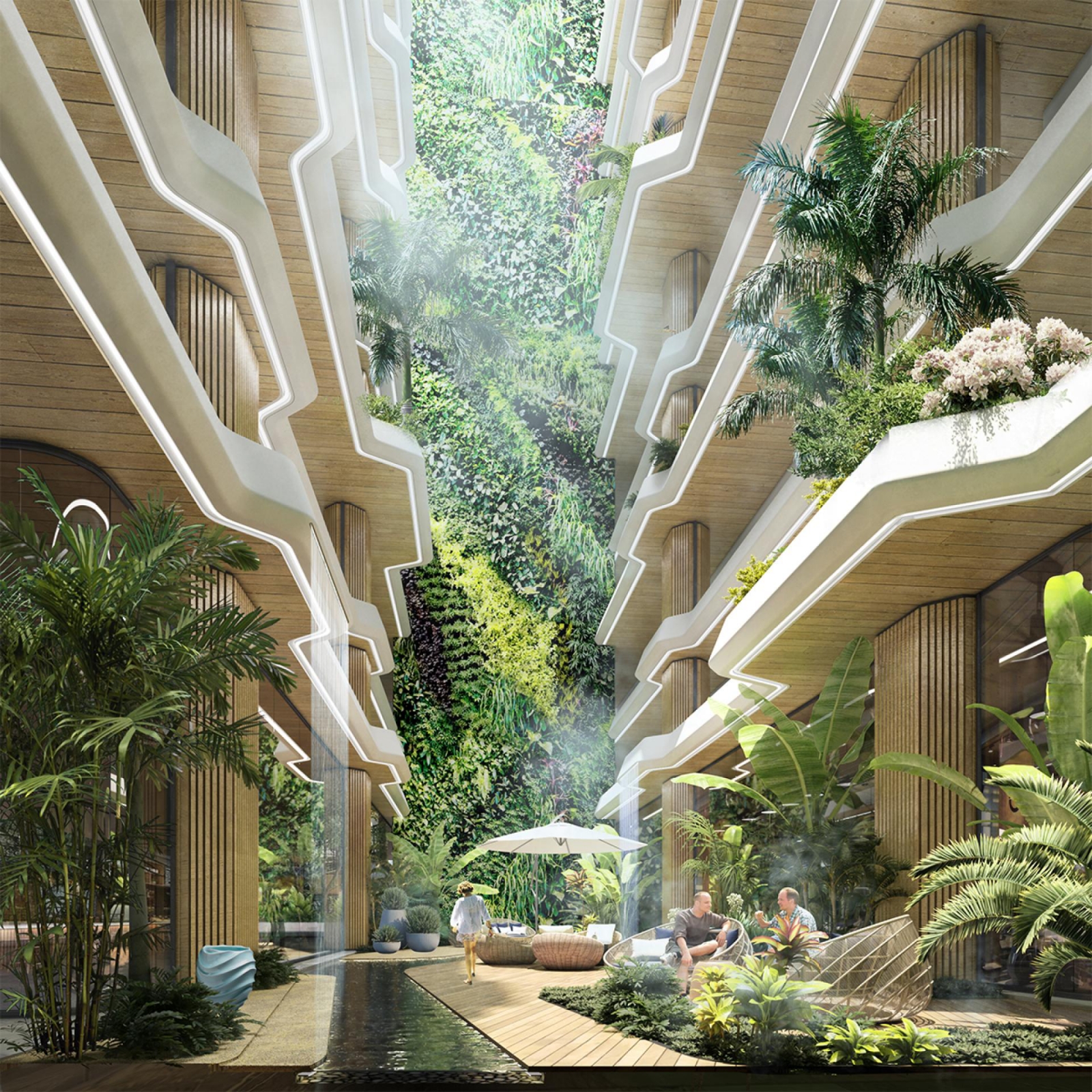 Sunshine Bay is home to multiple gardens, offering a visual contrast to its surroundings and enhancing its microclimate. Moreover, water features are placed throughout, providing an eco-friendly solution to hot weather. This verdant approach aids Sunshine Bay towards meeting various sustainability standards, such as Dubai’s Estidama design initiative.