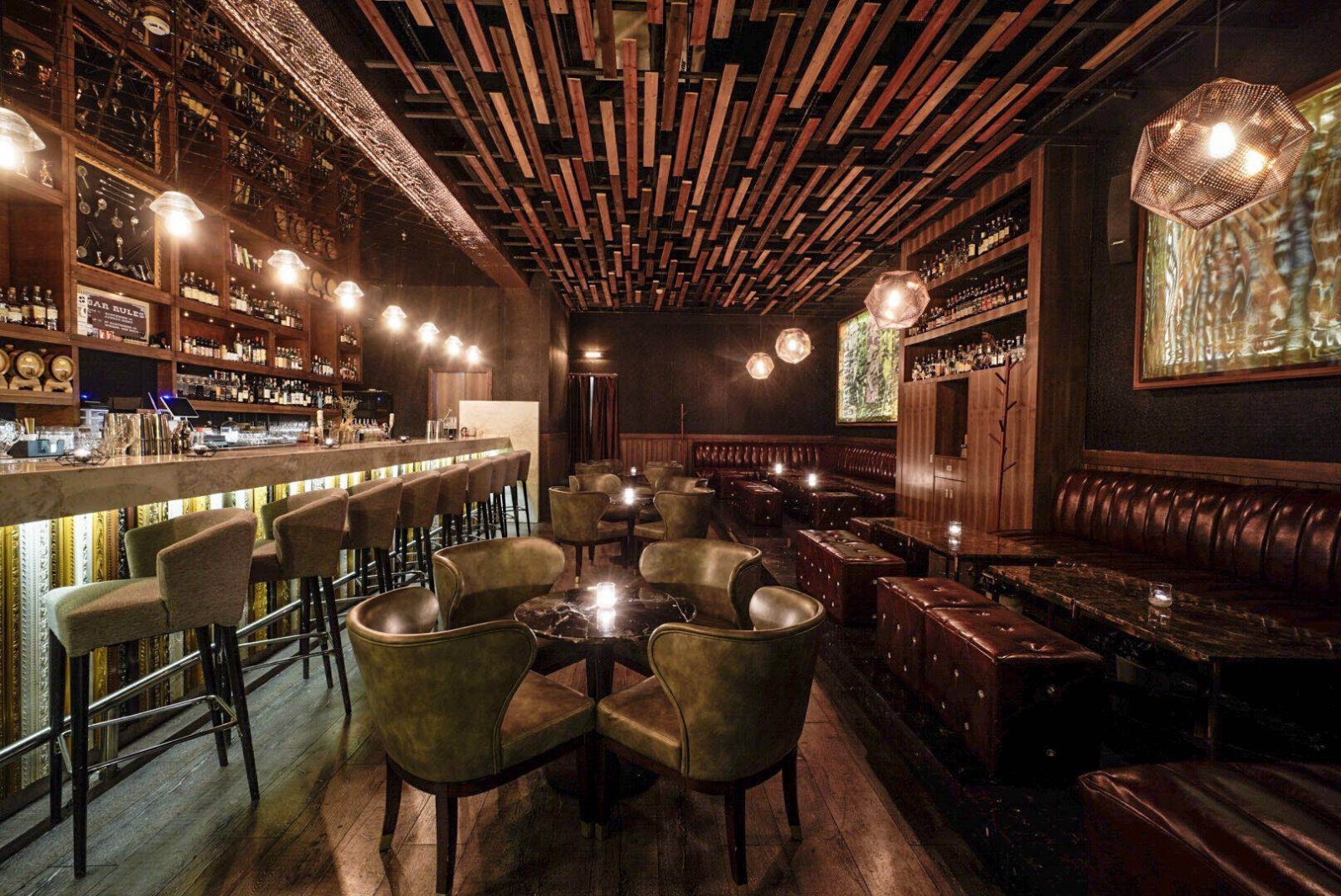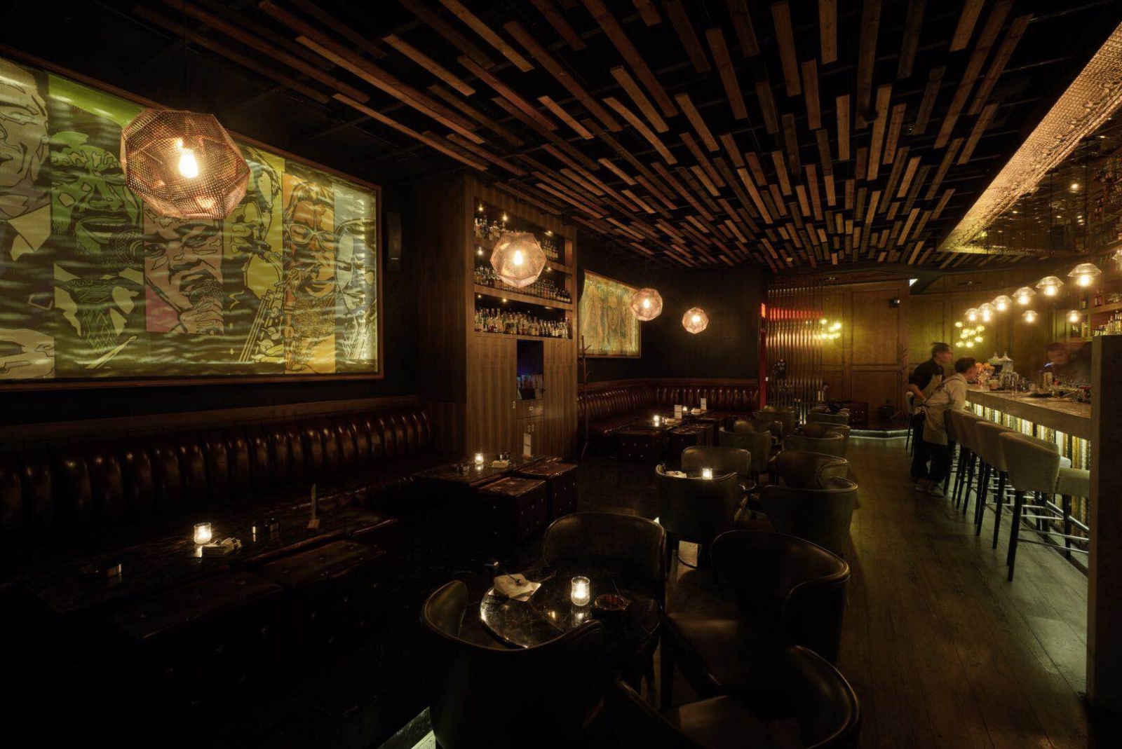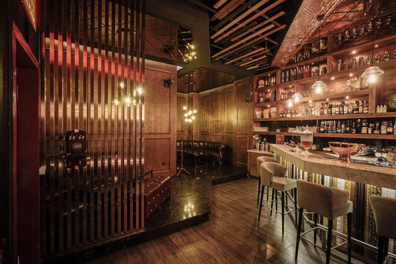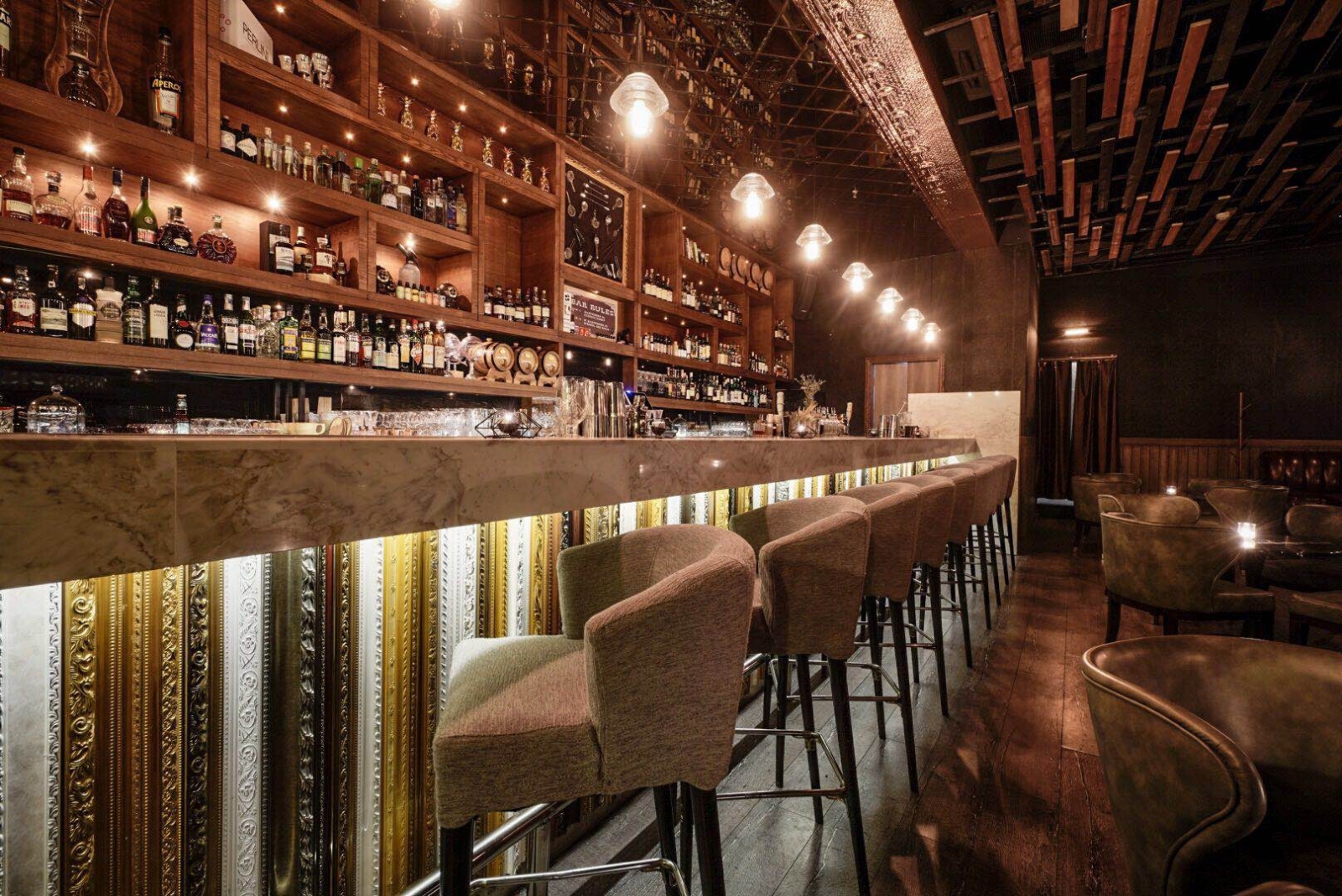 《上海enigima》不以堆疊裝飾彰顯風格,而藉材質紋理、光影語彙與結構節奏,緩步描繪出一座沈潛的空間世界。從不規則懸浮木構天花,到鍍鈦金屬與玻璃交織的主吧檯,最終至皮革與石材交錯的質地層次,每一隅轉折皆蘊藏時間的細語。本案於復古與工業語境間穿梭,於理性構築中納入情感語感,亦為老屋翻新與商空設計注入寧靜與別緻的當代表現。