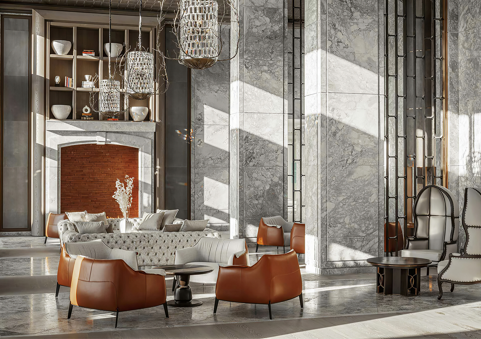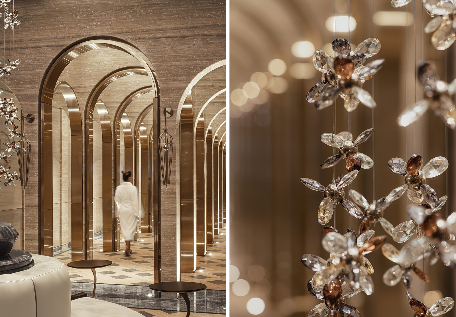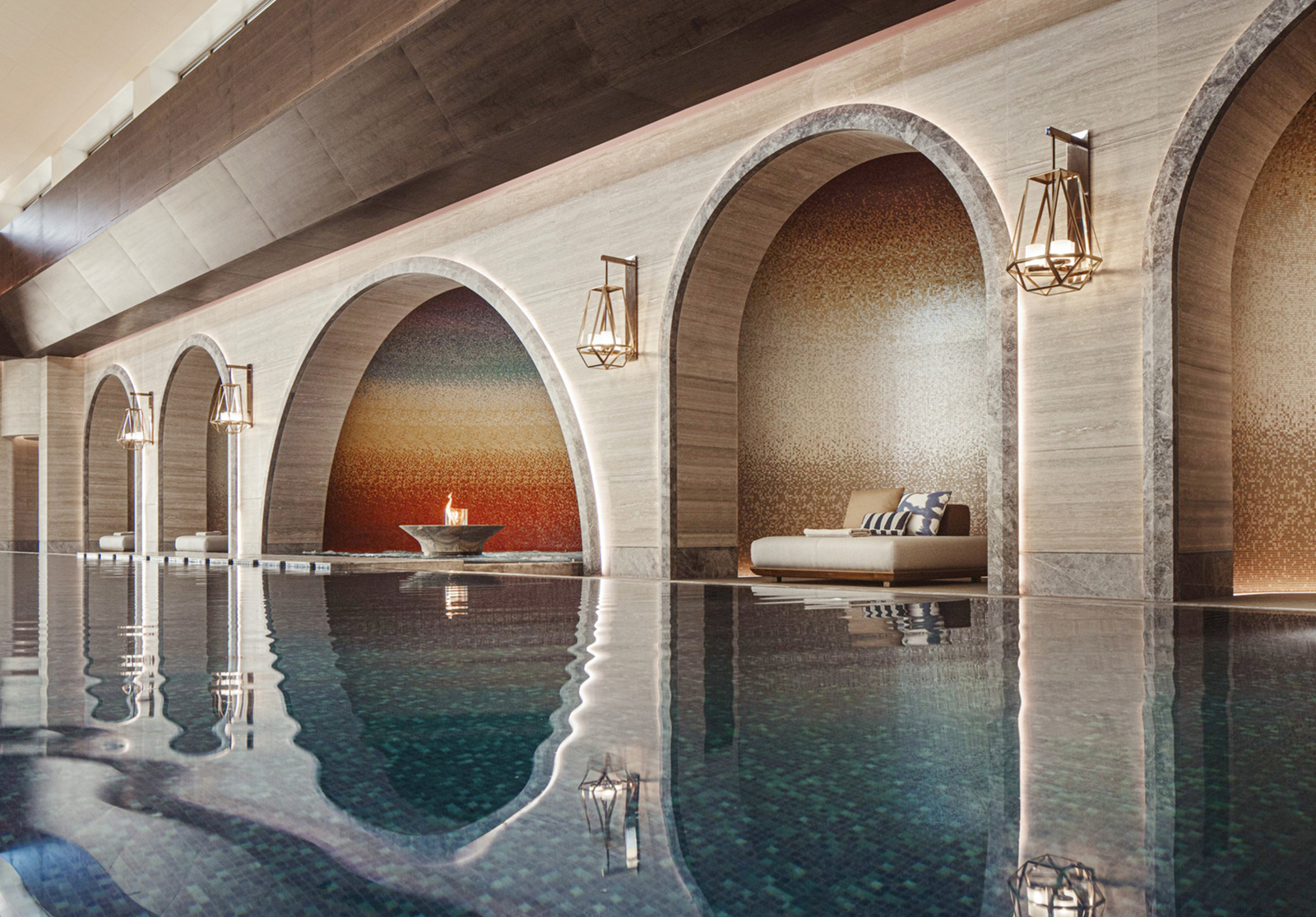 通往水療中心的路徑是邁向安定的儀式,汲取修道院迴廊的幾何語言,以俐落的金屬線條勾勒拱門形廓,與溫潤的沙色石牆形成剛柔並濟的對照。地坪交錯的幾何磚面引領視線緩緩推移,規律拱廊在視覺中層疊縮放。行進至水療核心,泳池區以銀色洞石與洗灰橡木構成穩定基底,搭配焦橙色調引導能量流動。弧形牆體與半圍合配置營造包覆感,消融喧囂復歸平靜。石材、金屬與柔光在明暗推移間交織,形塑出內斂而深層的奢華氣韻。