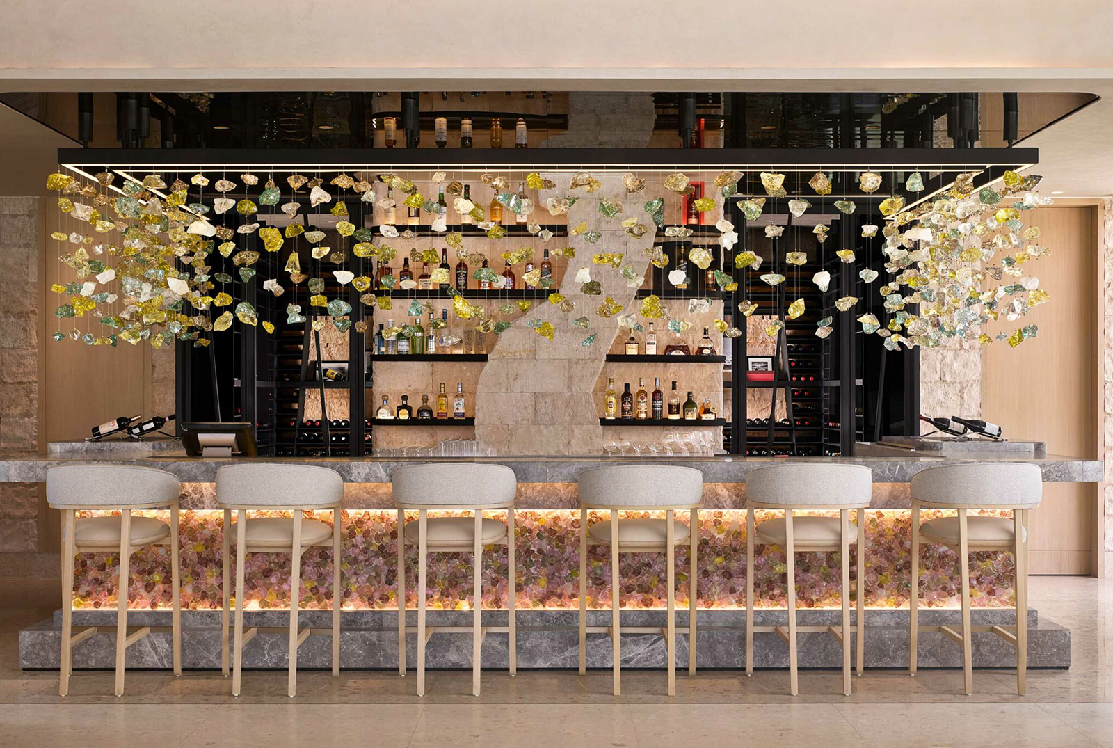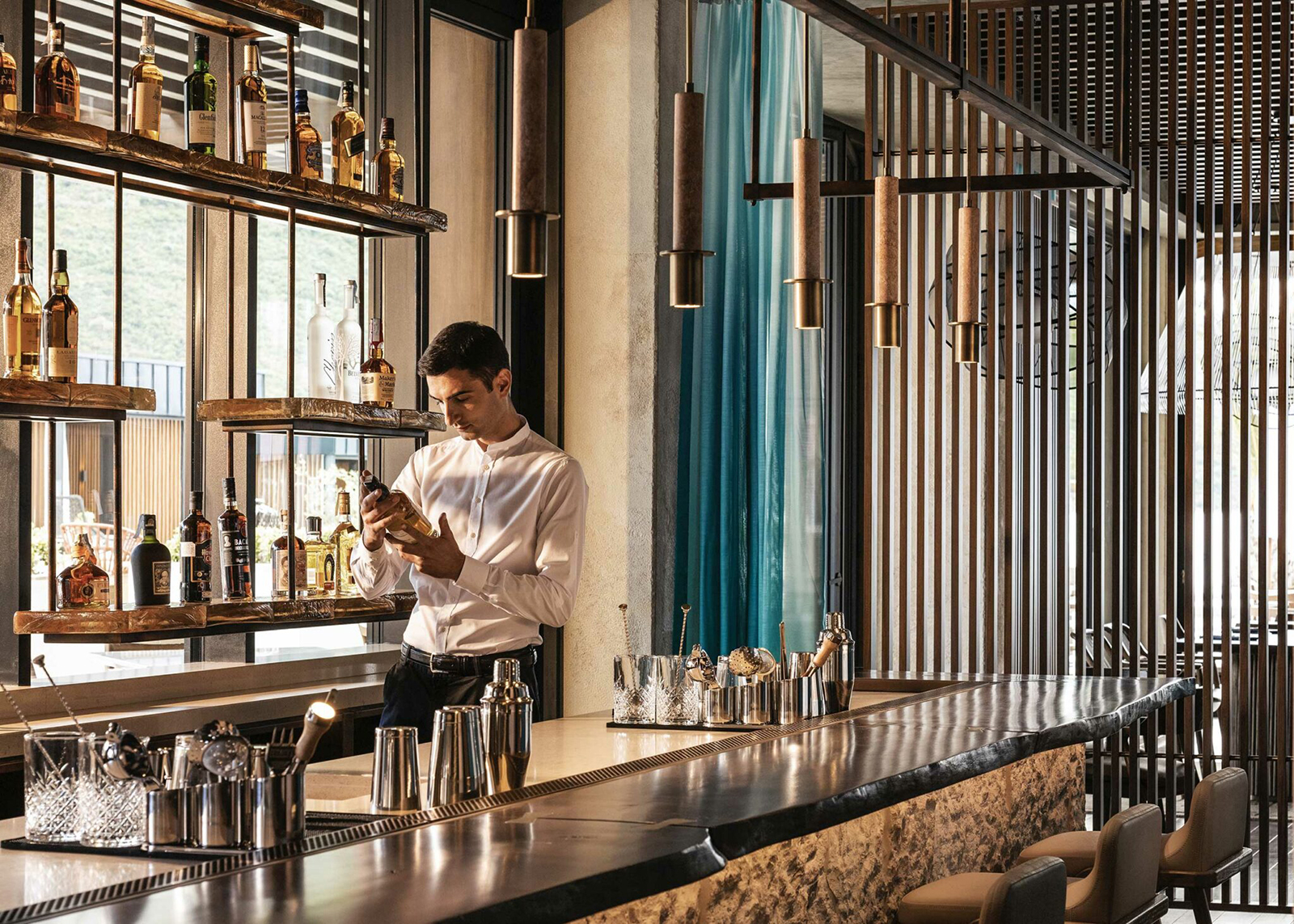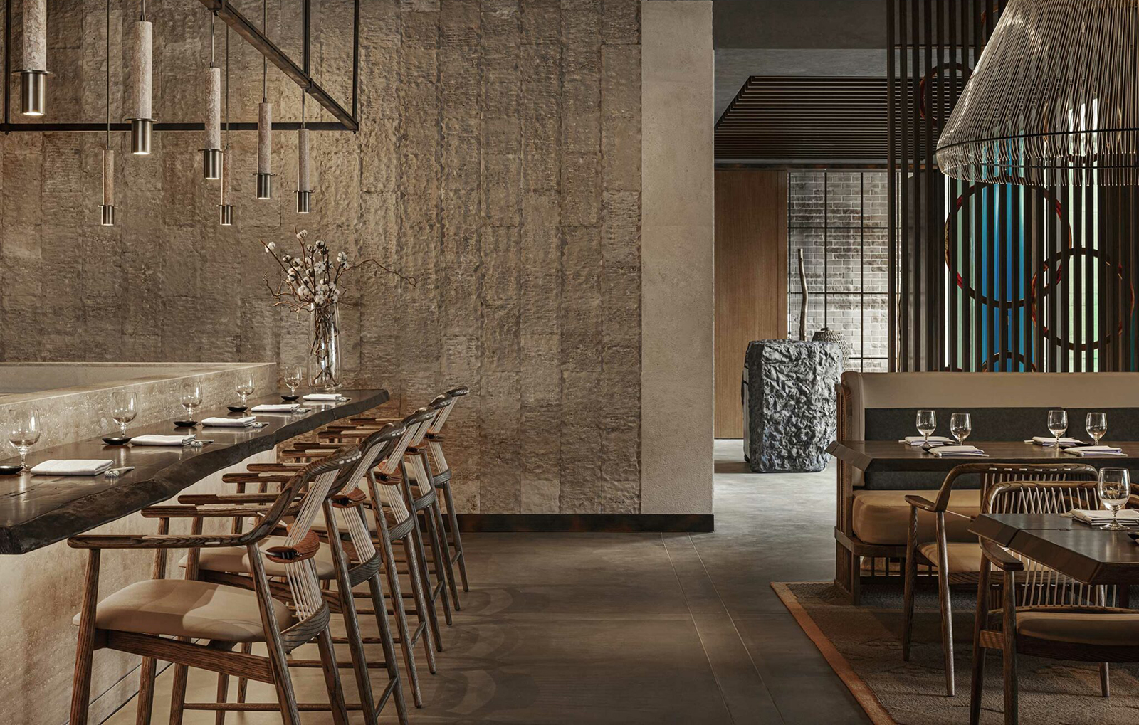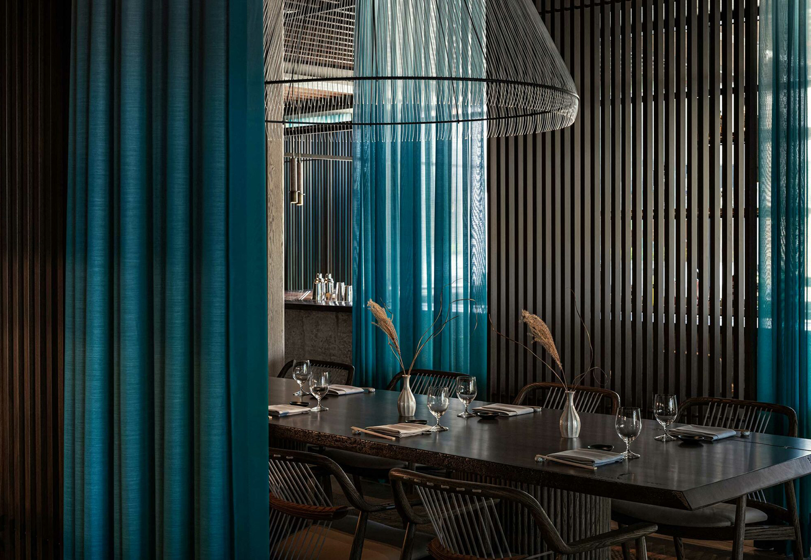 餐廳融合泛亞料理與日本侘寂美學,運用深色木格柵與金屬線條,構築出規律的垂直紋理,與戶外波光粼粼的海灣形成視覺呼應。原木吧檯區背景採用粗獷的天然石材堆疊,其凹凸起伏的質地在暖黃嵌燈的洗映下,展現出強烈的立體厚度。中央懸掛線狀吊燈,細膩的結構彷彿捕魚網具的現代轉譯,在空中勾勒出輕盈的幾何體積。半透明的藍綠色紗質帷幕如波浪般垂墜,在光影流動間注入地中海般的寧謐與層次。吧檯區採用剔透的晶體裝飾,內含沙粒的手吹玻璃燈飾點綴其間,呼應海邊沙粒在陽光折射下的質感;光感如水波般流轉,回歸海岸日常的從容狀態。