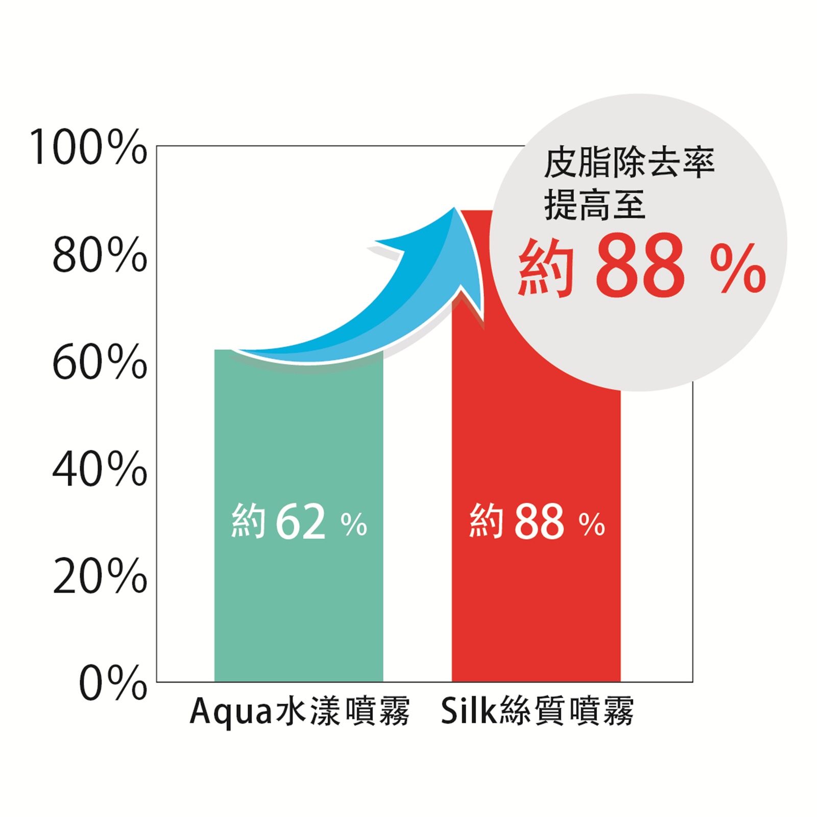 在上述測試條件下,將0.1 mL假性皮脂滴在人的手臂上並沖洗掉後,測量假性皮脂去除率。皮脂去除率因私人使用環境及個人差異而有所不同。(資料來源為驪住社內調查)