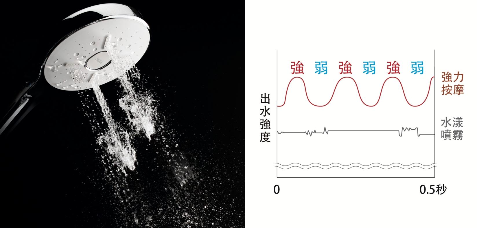 在此模式之下的水流具有強弱交替,宛如指尖律動,沖洗肩部、頭部、腰部等,喚醒疲憊的肌肉,消除疲勞,緩解來自日常生活當中的壓力。
