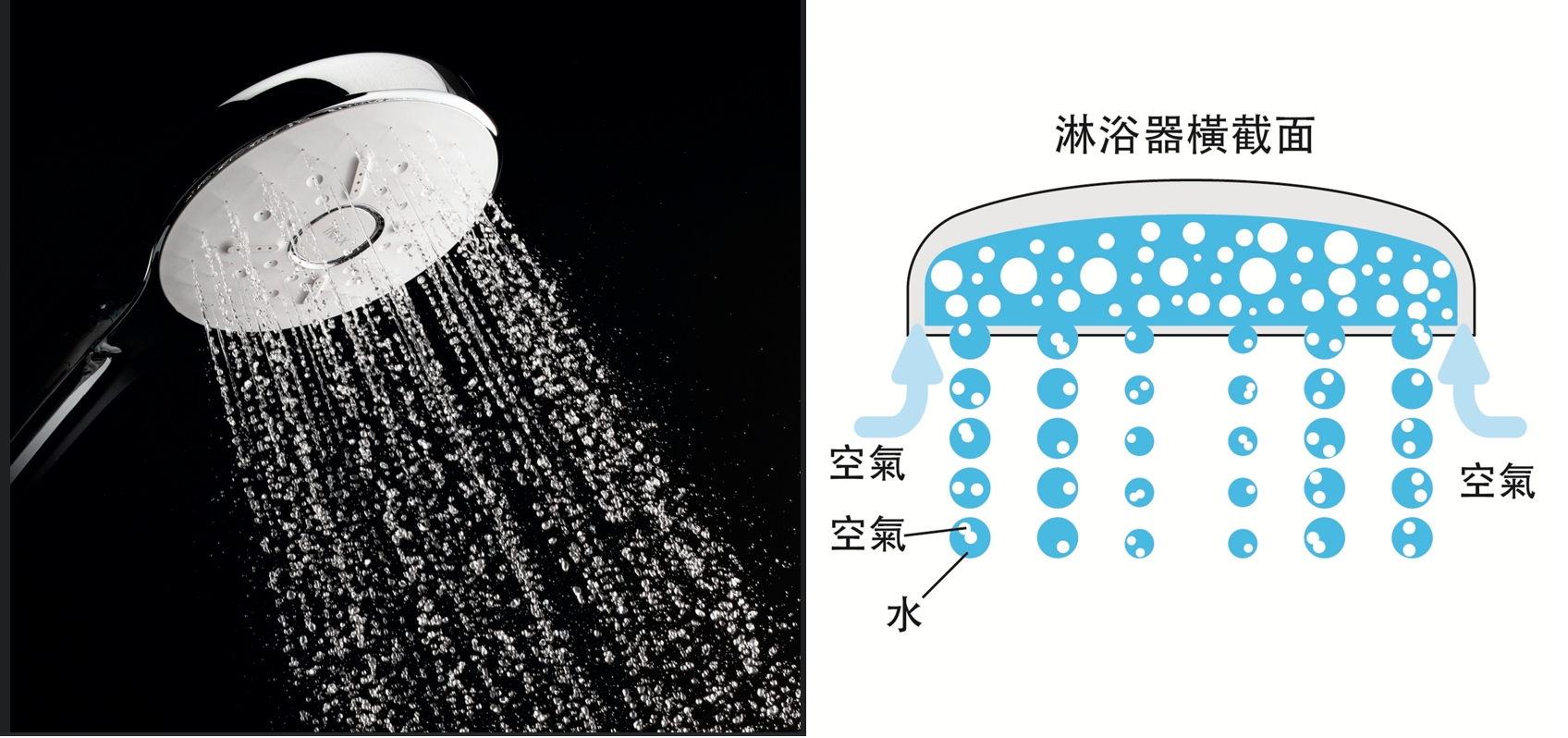 大顆粒的水柱中注入空氣,柔和的覆蓋全身,兼具舒適觸感與節水效果,達到洗淨與保濕的完美平衡。