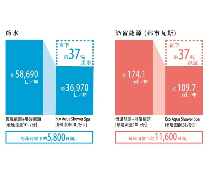 ECO Aqua Shower SPA具有更高的節約效能,一般四人家庭每年可省下約37%用水(相當於5,800日圓) 以及37%瓦斯能源(相當於11,600日圓) (註4)ECO Aqua Shower Spa | 三重淨化美肌體驗 升級沐浴新境界8