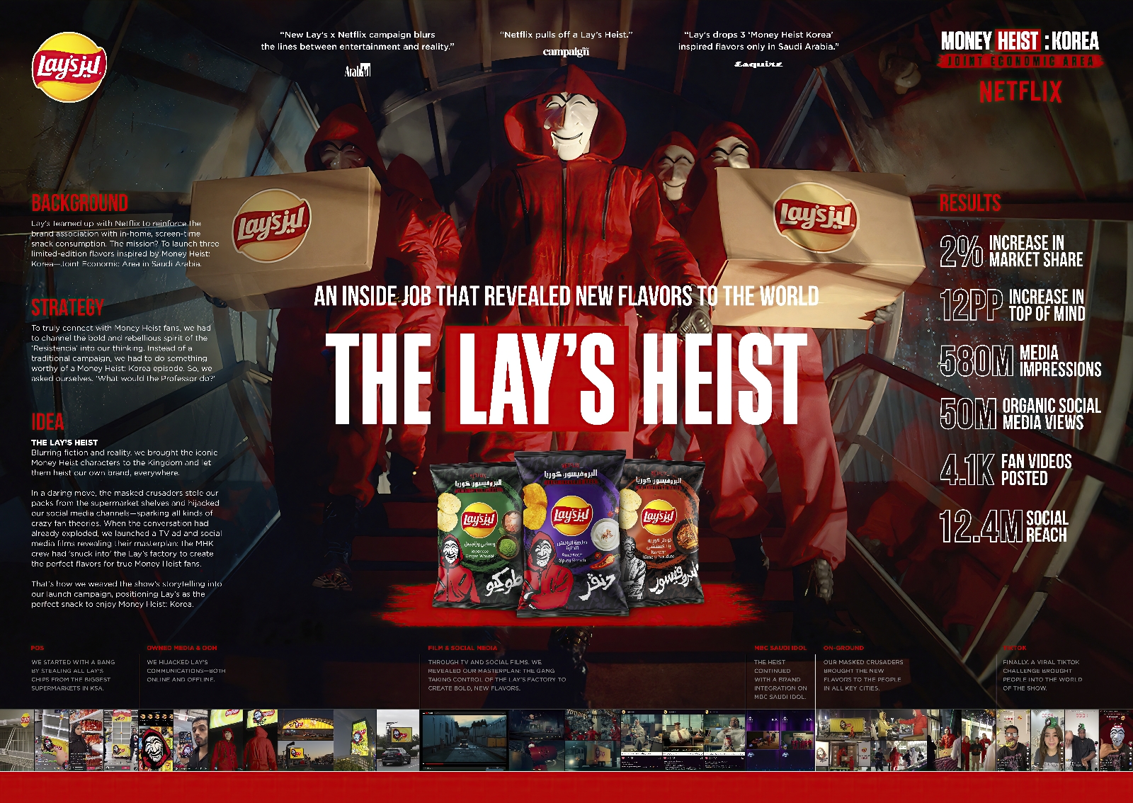 品牌形象是企業與世界溝通的橋樑,兩大知名品牌的跨界合作更是每每能為群眾帶來驚艷。在阿拉伯聯合大公國正上演著一齣詭譎的實境活動《The Lay’s Heist》,由知名飲食品牌樂事與影音媒體平台Netflix聯手,透過Netflix爆火影集:《紙房子》中的人物模糊虛構與現實的界限,將劇中的犯罪手法以更詼諧幽默的方式運用在樂事全新的產品口味,引領觀眾共同參與並感受這耳目一新且帶入感十足的異想實境秀,在視覺語言的體驗中感受產品的核心價值。