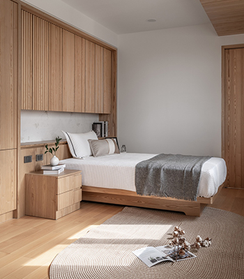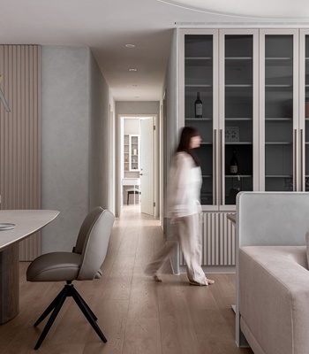 甫入公領域,設計師將客廳、餐廳與廚房做整合,擴展活動空間的範圍。其中配有兩處用餐區及一區中島吧台,增加使用者彈性的空間選擇,也能容納大量的賓客來訪。從客廳延伸至餐廚空間,以大理石電視牆銜接鋁製木紋櫃,剛柔並濟,調和出溫潤大方的空間調性。廚房特意採用玻璃隔間做區隔,不僅能維持整體視覺的通透感,亦能防止油煙逸散的問題。緩步移動至私領域,以沉穩內斂的灰色調與木質調相互搭配,營造出安穩舒適的休憩氛圍,令居者得以釋放壓力、舒緩情緒。