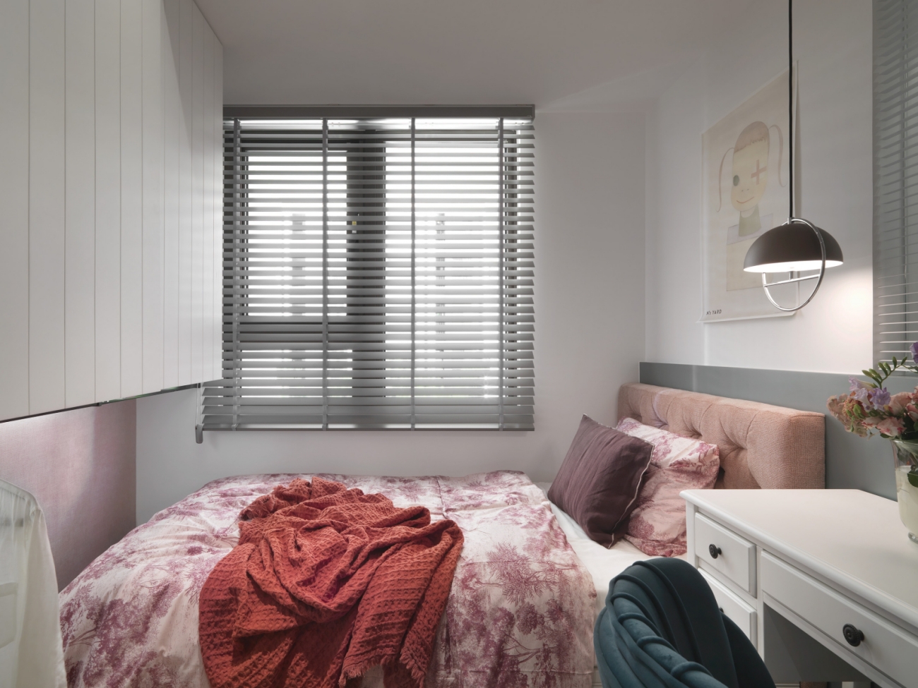 私領域過道導入墨綠色拱門語彙,柔化原有結構線條,為動線轉換注入古典節奏。臥室空間依需求分別鋪陳粉色、灰綠與中性色調,透過材質、色彩深淺與家具比例的差異,形塑各自性格,卻仍維持整體的一致性。全屋在白金灰階的中性基調中,以色彩軟件為節點、以精緻材質為細節,層層堆疊空間表情。珊瑚粉絲絨、勃艮第紅與復古墨綠分布其間,注入飽和張力;銀狐白大理石、鍍鈦金屬與枝狀吊燈則以克制手法點綴,使空間隨光影呈現多重表情。