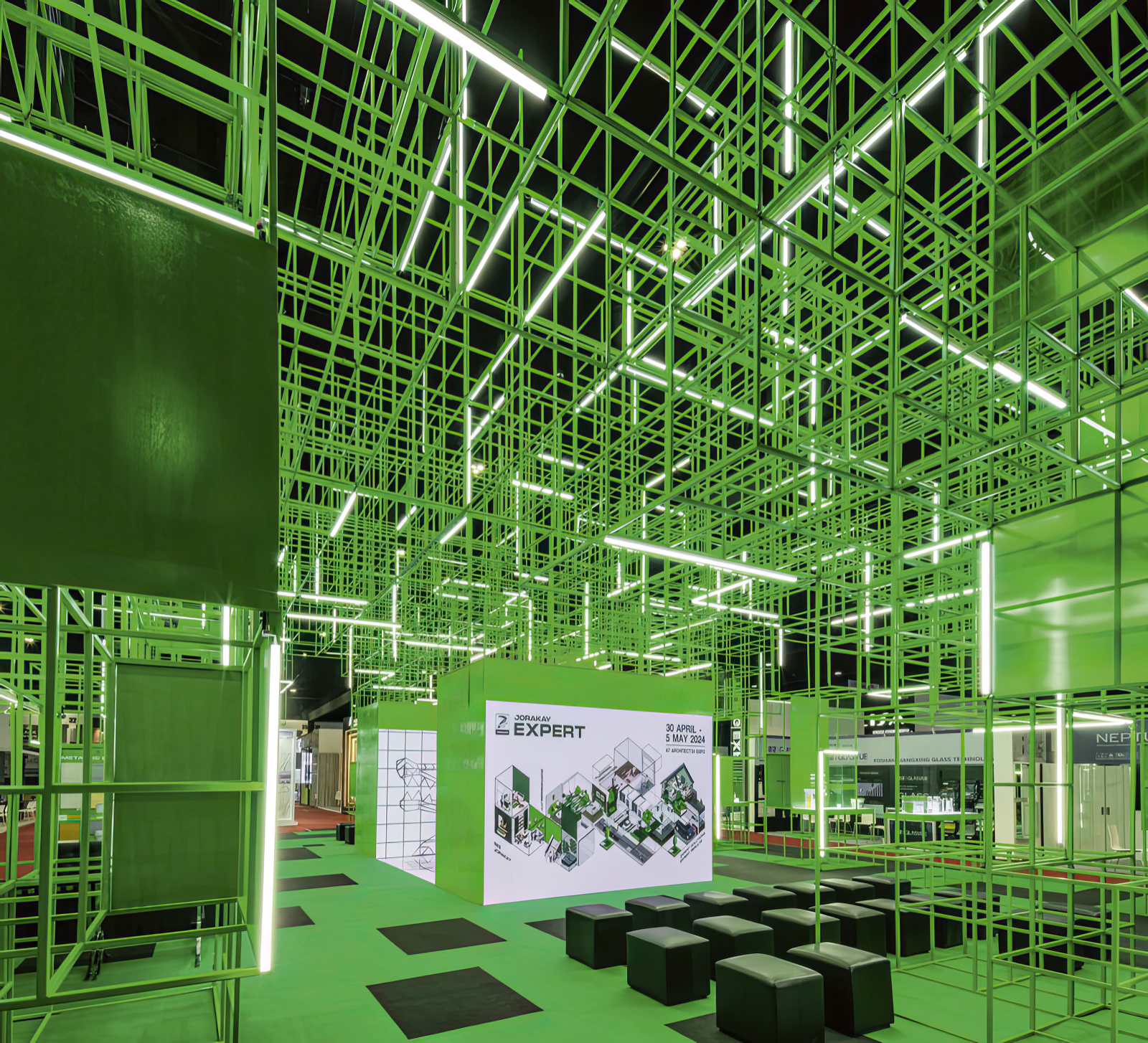 評審評語「順應品牌核心元素的綠色鱷魚,並與旗下建材相融合,展現出整體抽象且立體的展場風貌,猶如一座超脫概念與框架的藝術展品。」